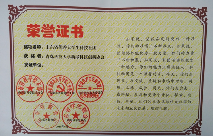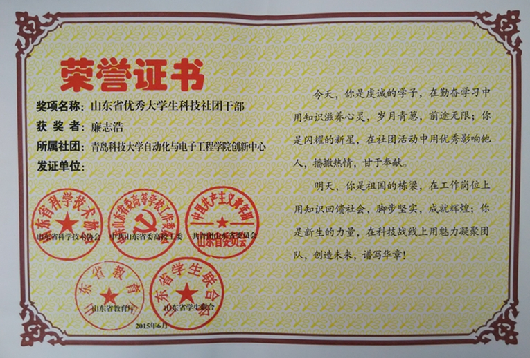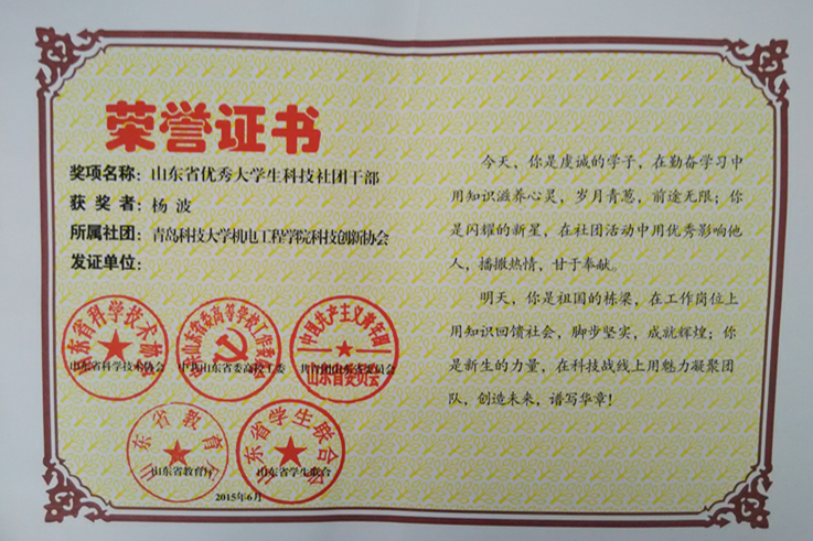 日前,山东省科学技术协会、山东省高校工委、共青团山东委员会、山东省学生联合会和山东省教育厅联合下发《关于表彰第七届山东省大学生科技节优秀科技社团和优秀科技社团干部的决定》,对来自全省各高校共计77家社团和88名社团干部分别进行表彰,米兰官网新绿科技创新协会荣获“2015年度山东省优秀大学生科技社团”,机电工程学院机器人创新协会会长杨波、自动化与电子工程学院创新中心主任廉志浩分别获选“2015年度山东省优秀大学生科技社团干部”荣誉称号。