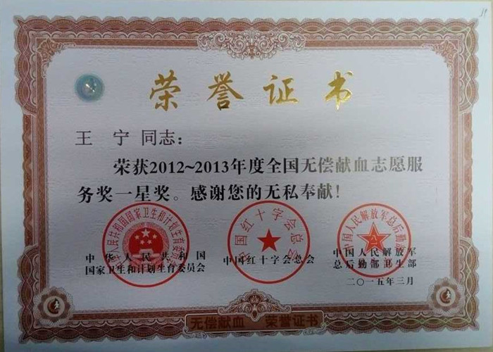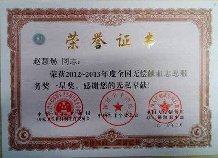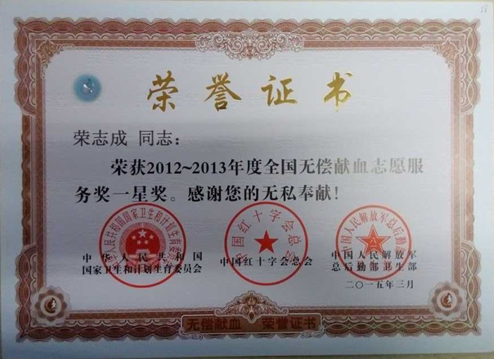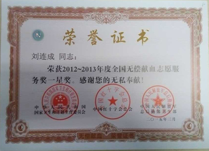 学校红十字学生分会会员刘连成(高分子学院橡胶121班)、荣志成(材料学院无机非金属121班)、王宁(化工学院生物工程121班)、赵慧旸(环境学院环境科学134班),荣获2012-2013年度全国无偿献血志愿服务奖一星奖。