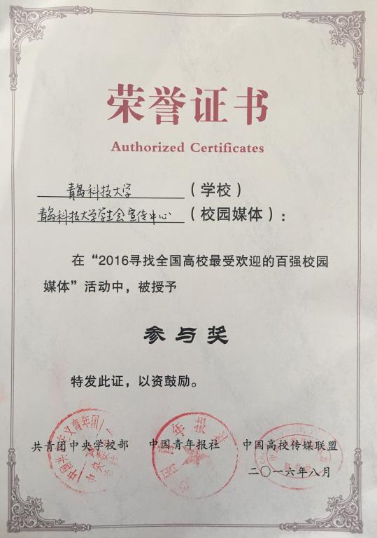 青岛科技大学学生会宣传中心在共青团中央学校部、中国青年报社、中国高校传媒联盟组织的“2016寻找全国高校最受欢迎的百强校园媒体”活动中获参与奖。