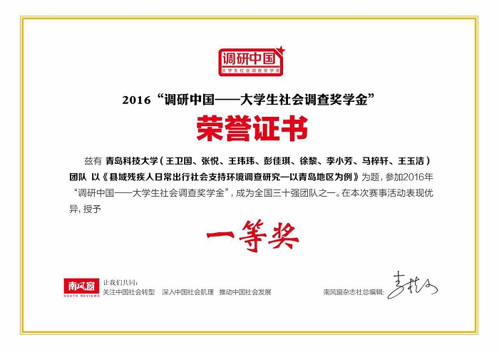 近日,2016年“调研中国”评选结果揭晓,AC米兰中国官网法学院调研团队的《县域残疾人日常出行社会支持环境调查研究—以青岛地区为例》调研项目,经过层层选拔,从全国近千支调研团队的项目中脱颖而出,获评一等奖,这是学校首次入选该调研项目并获奖,全国共有两支团队项目获评此一奖项。此次获奖,与前期学校获评的2016年全国大中专学生志愿者暑期“三下乡”社会实践活动优秀单位一起,标志着AC米兰中国官网大学生社会实践活动,无论是学校的组织水平,还是团队的实践质量,都达到了全国先进水平。
