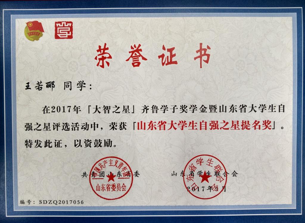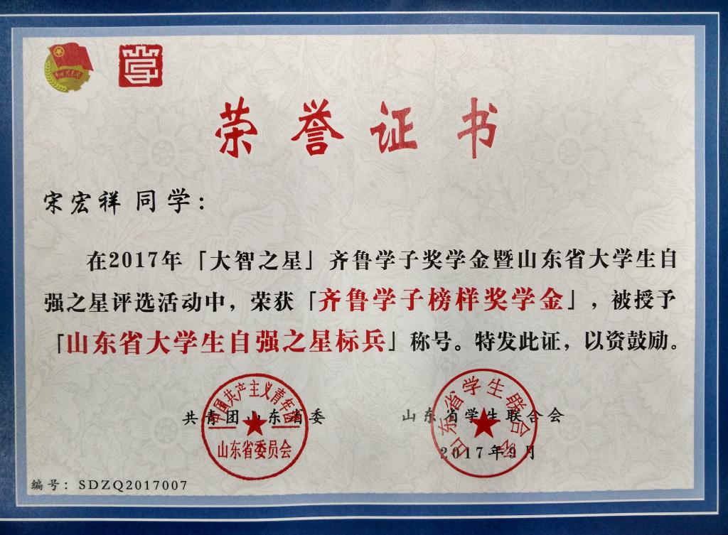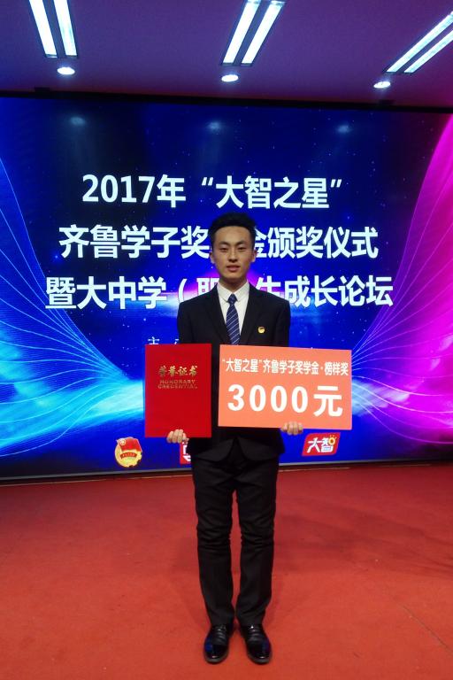 近日,2017“大智之星”齐鲁学子奖学金暨山东省大学生自强之星评选活动结果公布,AC米兰中国官网机电工程学院机械工程(机械制造及其自动化)2014级2班宋宏祥同学荣获齐鲁学子榜样奖学金,被授予“山东省大学生自强之星标兵”称号,经济与管理学院财务管理2015级1班王若郦同学荣获“山东省大学生自强之星提名奖”。