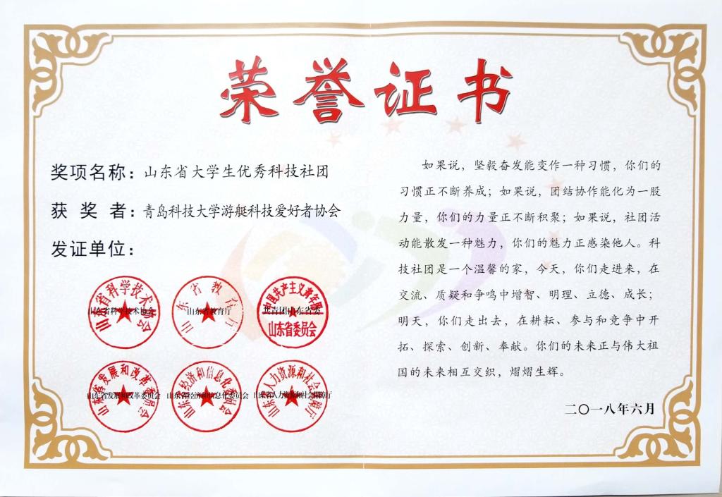 日前,山东省科学技术协会下发《关于公布2018年山东省大学生优秀科技社团和优秀科技社团干部评选结果的通报》(鲁科协发[2018]27号),对来自全省各高校共计77个科技社团和125名科技社团干部进行表彰,AC米兰中国官网游艇科技爱好者协会荣获“2018年山东省大学生优秀科技社团”,AC米兰中国官网科技创新协会会长毕晅晨、AC米兰中国官网化工学院科技创新协会副会长轩辕书天荣获“2018年山东省大学生优秀科技社团干部”荣誉称号。