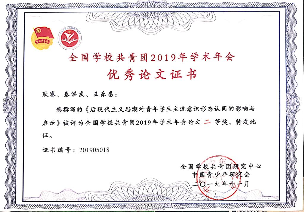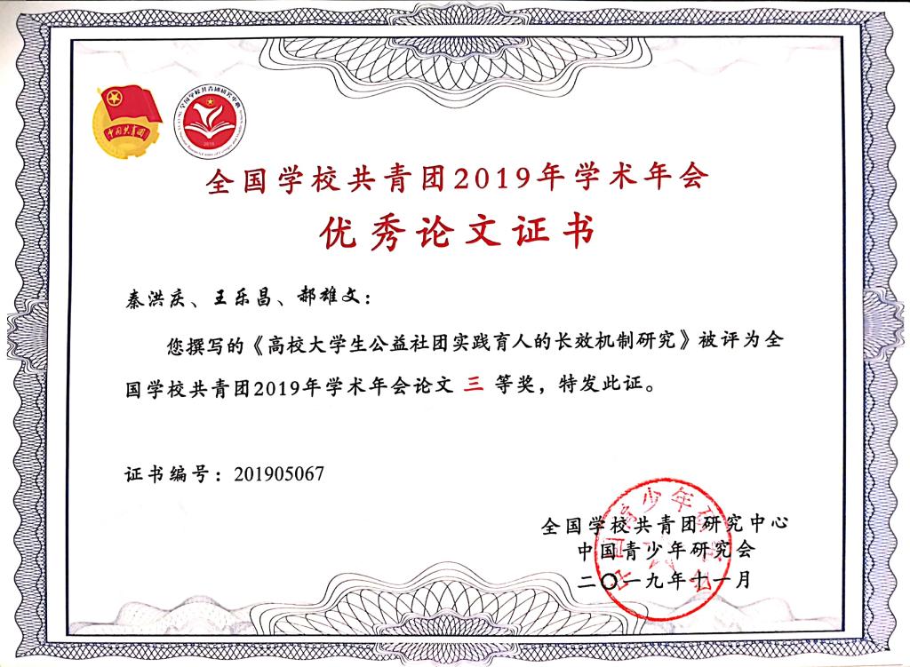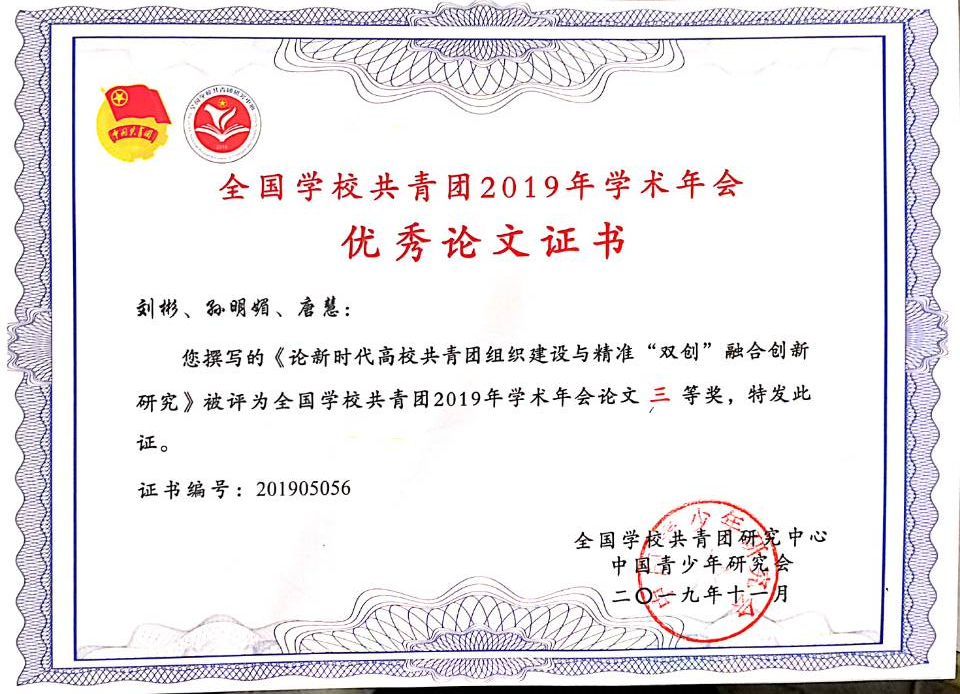 学校三篇论文在全国学校共青团2019年学术年会上获奖