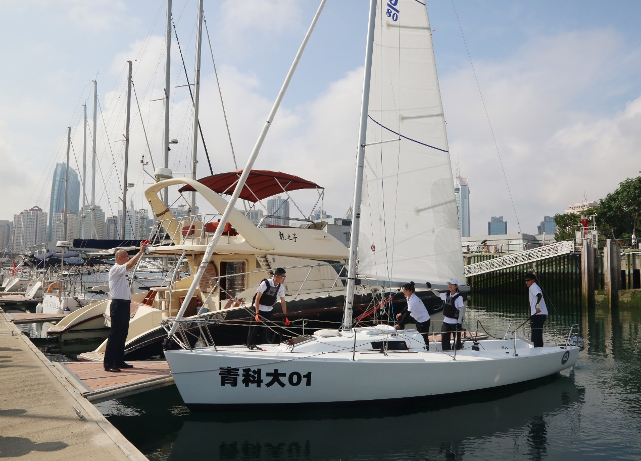 仪式结束后,校领导和各部门主要领导在帆船队教练员、队员的陪同下为青科大01号帆船鸣笛起航。