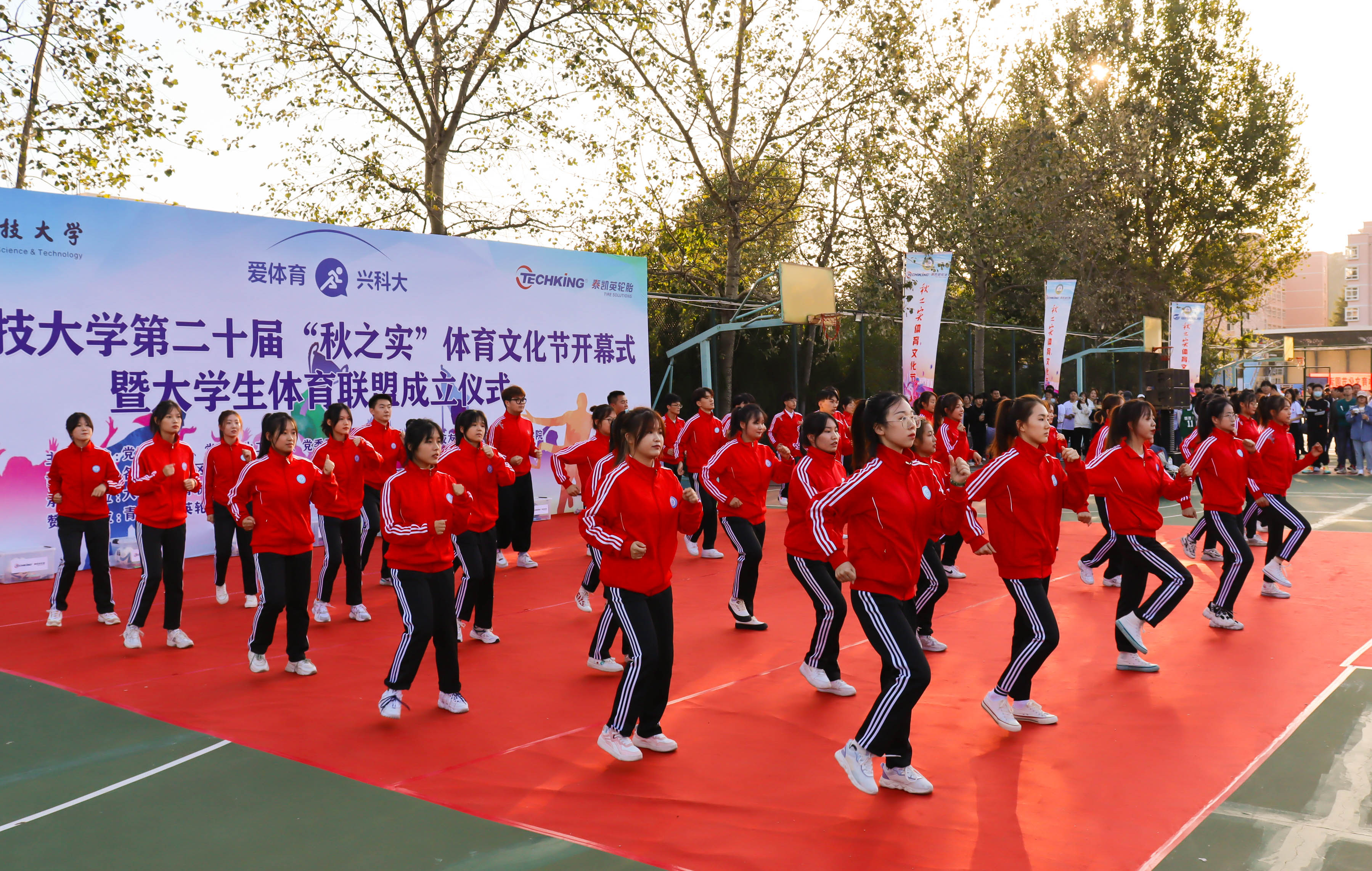 10月12日下午,学校第二十届“秋之实”体育文化节开幕式暨大学生体育联盟成立仪式在崂山校区南苑操场举行,党委常委、副校长丁林,党委常委、宣传部部长陈刚,青岛泰凯英轮胎有限公司董事长兼总裁王传铸、副总裁徐芳出席仪式。
