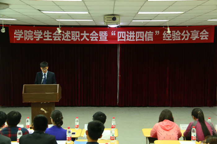 会上,各学院学生会主席就过去一学年的工作,结合“四进四信”活动,通过PPT展示,从思想引领、组织建设、活动开展、工作成绩、工作特色等方面做了介绍,全面介绍了本学院学生会过去一学年的工作开展情况,展示了各学院学生会的工作成绩和特色、风采,展现了学生会的规划化建设进程。答辩会上,由各学院学生会秘书长和校学生会主席团成员组成的评委团,就各学院学生会的述职答辩情况,进行了客观公正的评价,评价结果将作为学校先进学生会评选的重要依据。