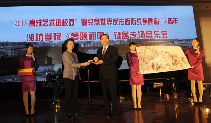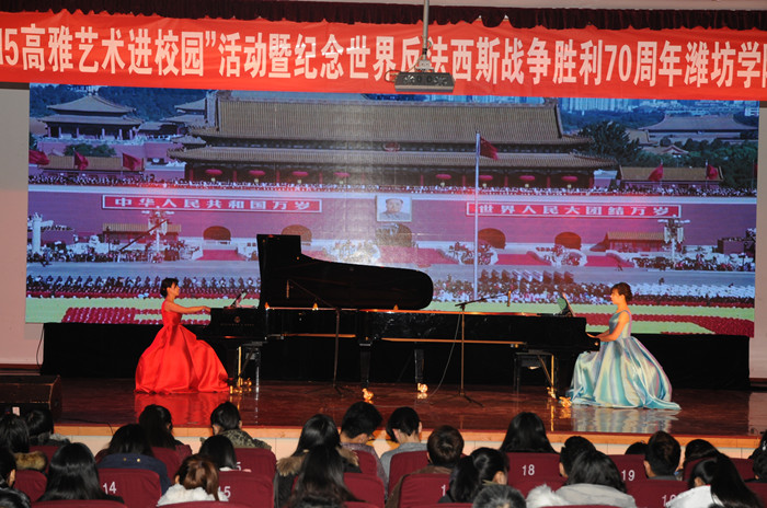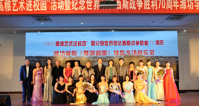 曲声悠扬,琴颂祖国。12月22日晚,“2015高雅艺术进校园”活动暨纪念世界反法西斯战争胜利70周年潍坊学院《琴颂祖国》键盘专场音乐会在崂山校区第二报告厅举行。潍坊学院副院长朱猷武、AC米兰中国官网副校长张淑华、原潍坊学院院长王守伦等与七百余名师生共同欣赏了演出。