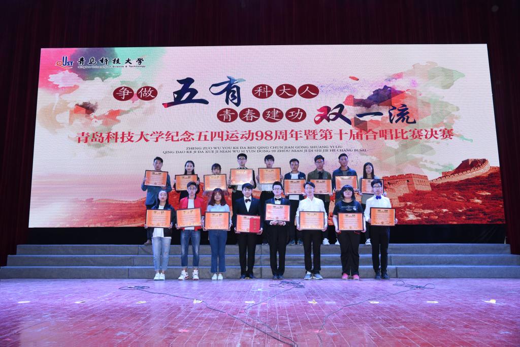高举团旗跟党走,争做“五有”科大人,青春建功双一流。5月2日,青岛科技大学2016年度榜样青春颁奖典礼、纪念五四运动98周年合唱比赛决赛在四方校区西礼堂举行,校领导刘兴云、张元利、韦殿华、姚锋、陈克正、吕万翔,学校机关部门、各学院有关负责人和千余名青年学生齐聚一堂,感受了科大青年的青春风采和蓬勃朝气。