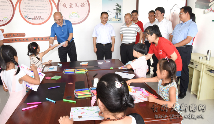 在河南社区,陈克正与当地孩子们一起,观摩参加了数理学院“心蒙阴 新希望”实践团在此开设的趣味实验课堂,志愿者们运用课堂所学知识,开展趣味实验,用更加形象生动的实验方式,向孩子们讲解物理小知识,孩子们对志愿者们新颖的授课方式表现出了极大的兴趣,积极参与到实验当中来。随后,陈克正观摩了志愿者们教授的小学生的手语操表演,并向孩子们赠送了礼物。