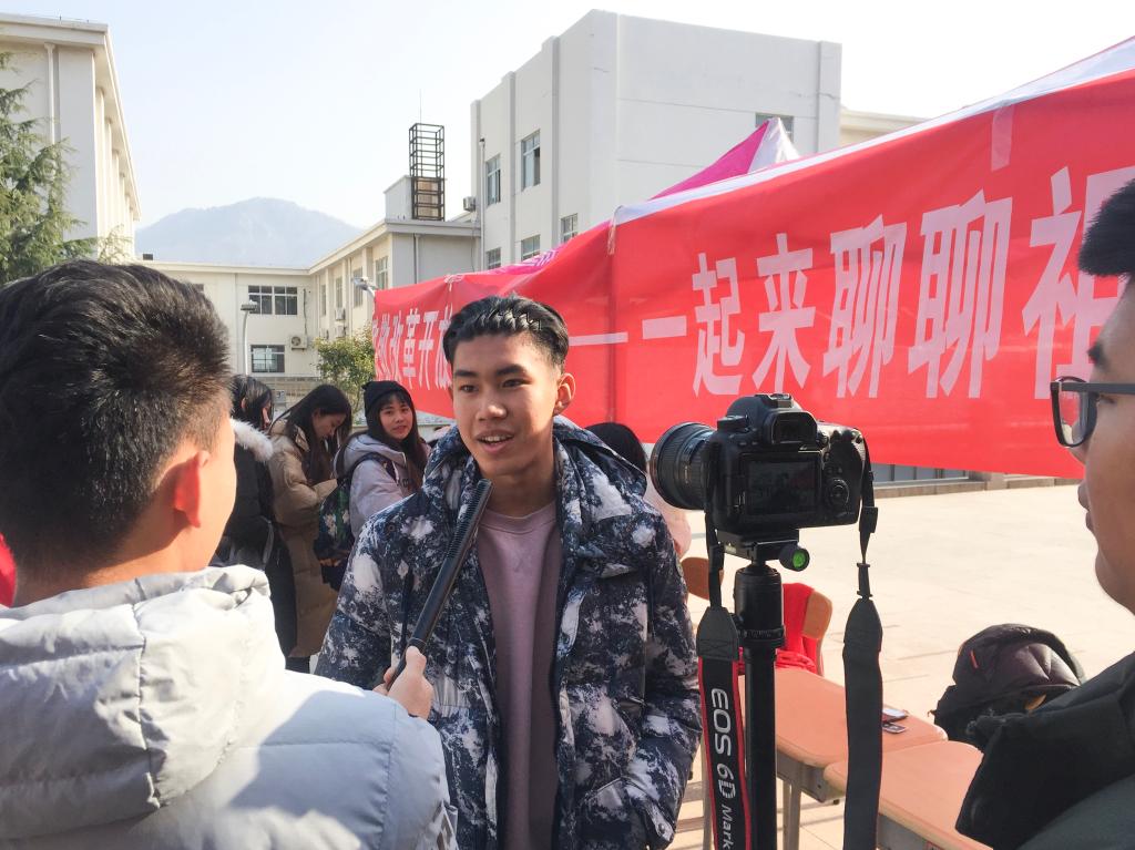 18日中午,“致敬改革开放40周年——一起来聊聊祖国的变迁”的采访活动在南苑餐厅东门举行。活动现场气氛热烈,广大青年学生争相参与,从科技、军事、生活等各个方面讲述了自己眼中改革开放以来的翻天覆地的变化。