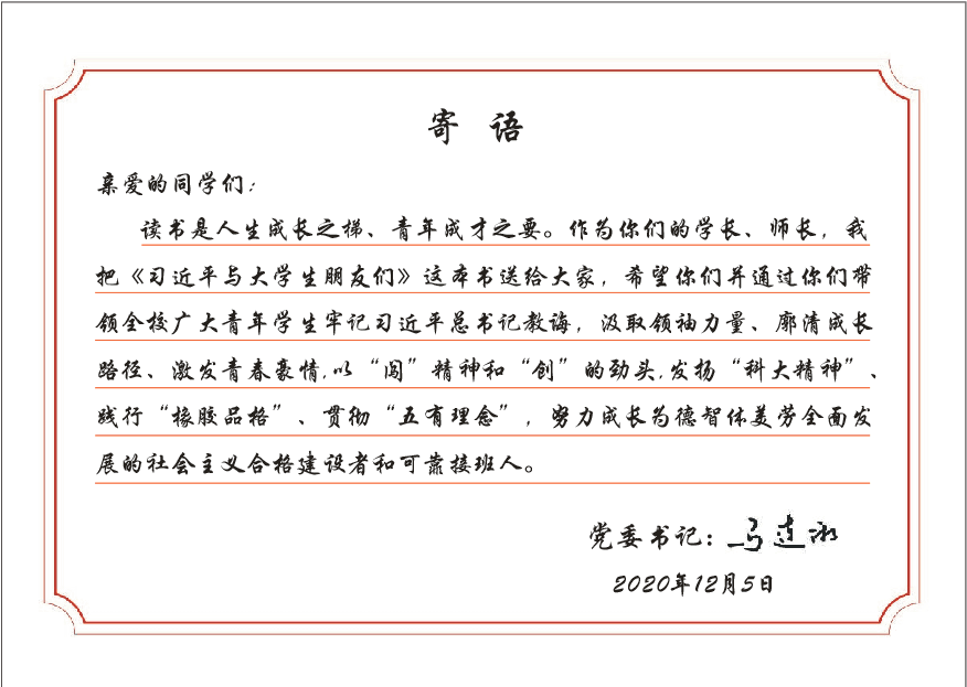 二是紧跟时代步伐,做守正创新的青科大人。当今新时代,是青年学生最值得珍惜、最有作为的大好时代。全校青年学生要紧跟时代步伐,听党话、跟党走,按照党委的布置要求,融入中心、服务大局,继承传统、开拓创新,深刻认识和把握经济社会发展规律,准确识变、科学应变、主动求变,珍惜光阴、珍惜机会、珍惜时代,把“创新、协调、绿色、开放、共享”的新发展理念转化为自身成长成才的方法路径,勇于创新,善于作为,开启人生事业发展的“双循环”。