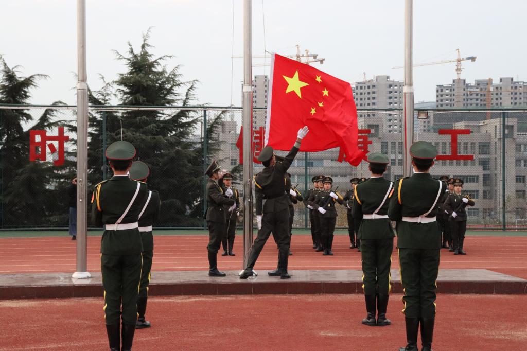 七点整,迎着朝阳,国旗护卫队的成员昂首挺胸、精神抖擞,迈着铿锵有力的步伐,护卫鲜艳的五星红旗入场。在慷慨激昂的国歌声中,五星红旗冉冉升起。在场师生面向国旗庄严肃立,深怀着对祖国无限的热爱和崇高的敬意,行注目礼。