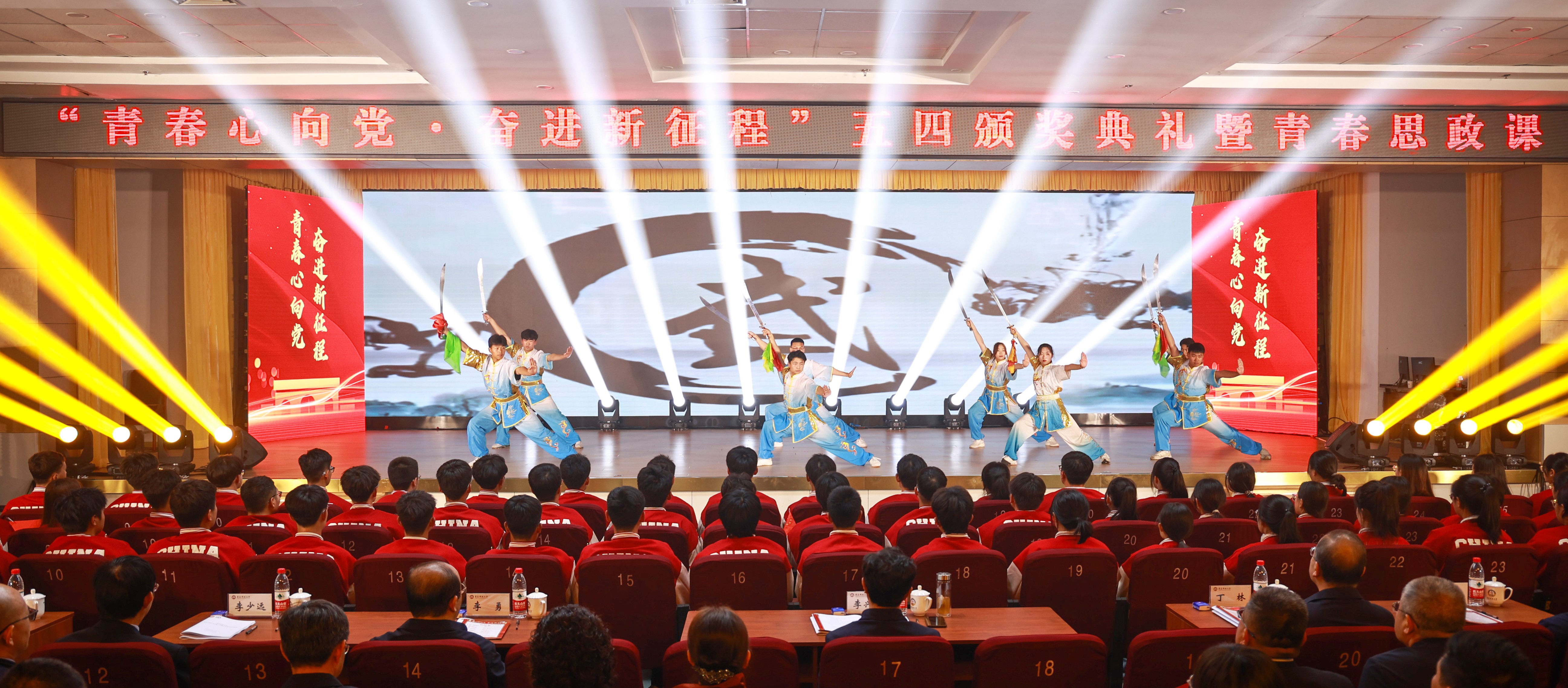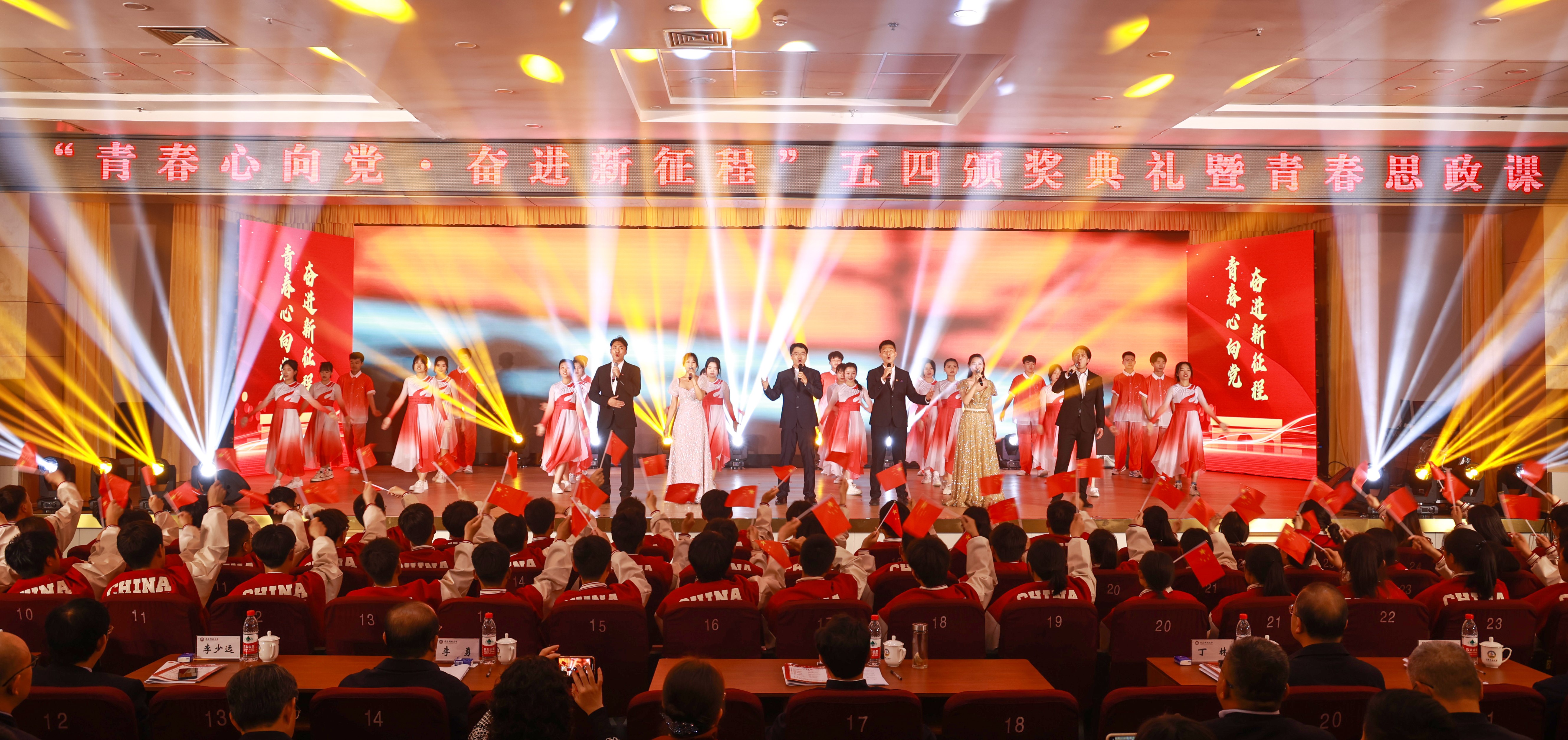 本次五四颁奖典礼暨青春思政课,是学校共青团在全校上下蓬勃开展学习贯彻习近平新时代中国特色社会主义思想主题教育之际,立足“学思想、强党性、重实践、建新功”目标要求,坚持在真学真信真用、学懂弄通做实上下功夫的生动实践,也是全校团员青年深入学习宣传贯彻党的二十大精神阶段性成果的有力展示。学校各职能部门负责人、院级单位负责人代表,团学骨干、青年学生代表现场参与本次活动,全校团员青年同步线上观摩。
