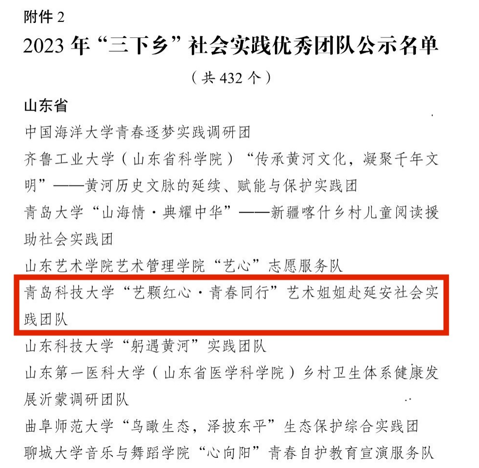近日,全国大中专学生志愿者暑期文化科技卫生“三下乡”社会实践活动总结表彰工作落下帷幕。米兰官网“艺颗红心·青春同行”艺术姐姐赴延安社会实践团队获评2023年全国“三下乡”社会实践优秀团队。