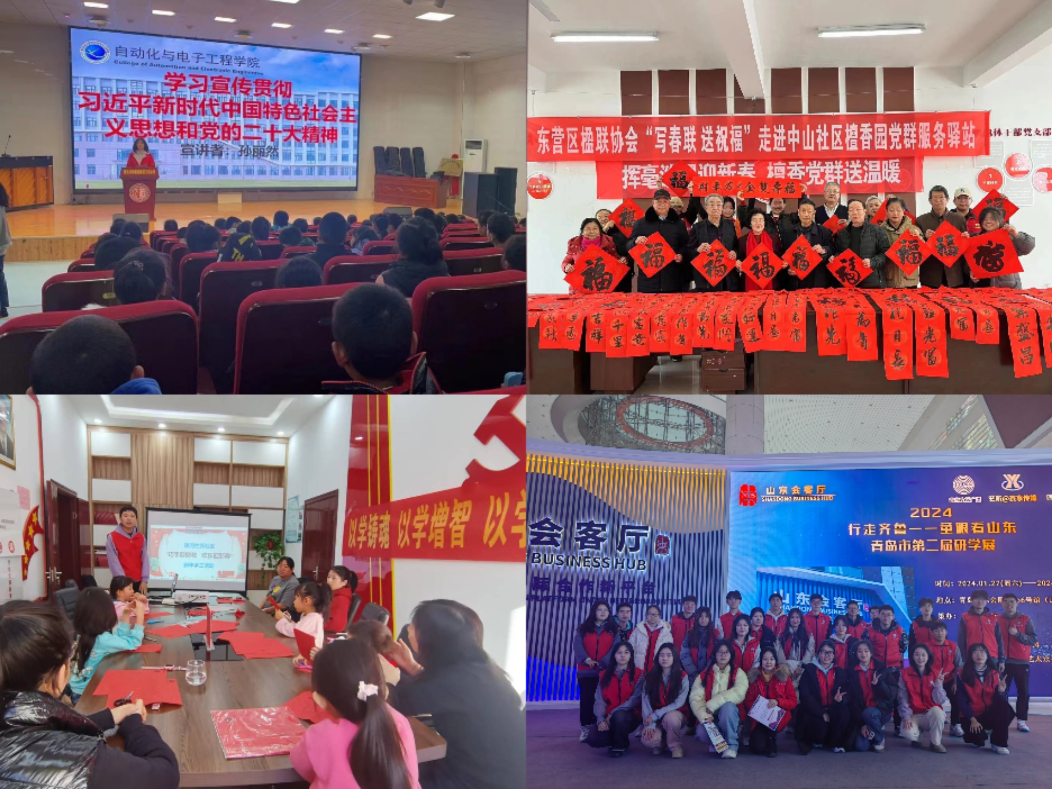 校团委组织招募1042名团员青年志愿者参与“传承优秀文化,赓续中华文脉”全国大学生2024年寒假“返家乡”社会实践一起云支教专项活动,通过“线上+线下”、“分散+集中”的方式关爱关注祖国偏远山区留守儿童,引导青年学生用青春行动明确强国使命,胸怀时代内涵,为实现第二个百年奋斗目标、实现中华民族伟大复兴做出新的贡献。组织全校团员青年开展寒假期间青岛市文明实践系列活动,围绕“青年引航”、“青传礼蕴”、”青力青为“、“青春倡德”、“青言青语”主题开展,在有力服务地方志愿服务实际需求的同时,让“志愿者、找青科”特色品牌深入人心。高分子学院团委以学习宣传贯彻习近平新时代中国特色社会主义思想为指导,以“橡尚笃行·奉献青春”为主题,引导学生通过政务实践、乡村振兴、公益服务等方式在家乡地市所辖乡村振兴重点帮扶村开展社会实践,将书本知识与群众实践进一步结合,引导青年学生用脚步丈量祖国大地,锤炼意志品格,磨炼社会化能力,贡献青春“橡尚”力量。马克思主义学院团总支持续开展青马铸魂读书工程,依靠“小老师讲大理论”习近平新时代中国特色社会主义思想宣讲团红色文化品牌,面向街道、中小学、高校,开展分众化、有针对性的宣讲10余次,以“共情”达到“共鸣”,让党的创新理论真正在群众中“听得懂、看得见、悟得深”。
