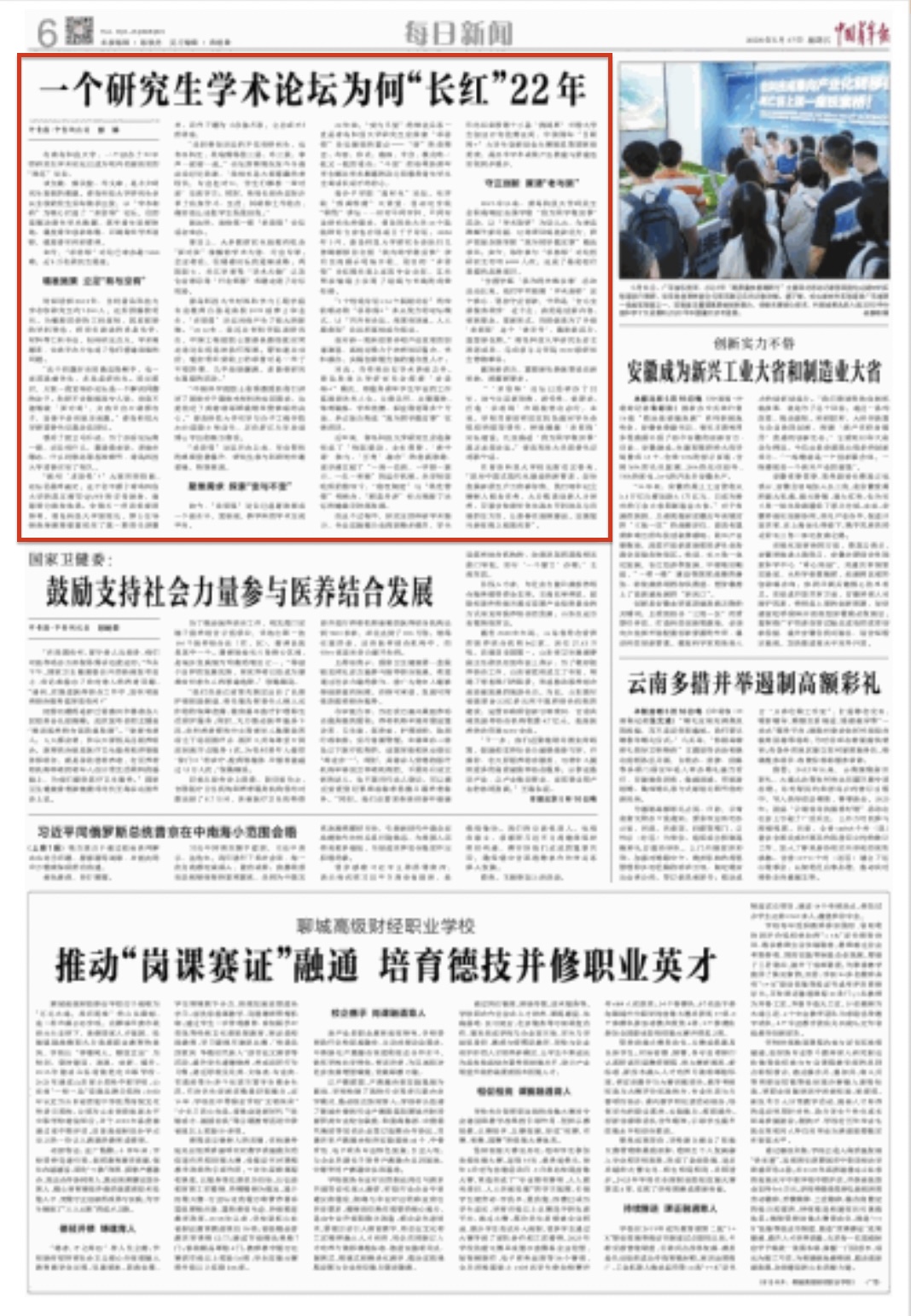 5月17日,《中国青年报》(第六版)刊发文章《一个研究生学术论坛为何“长红”22年》,深入报道米兰官网“求思得”论坛创新案例。文章介绍了米兰官网围绕立德树人根本任务,从“求思得”论坛创办初心,聚焦需求与时俱进,到为老品牌赋予新内涵,获评首届全国学联“我为同学做实事”精品项目的历程进行细致梳理,厘清“求思得”论坛“长红”22年的根本原因,受到广泛关注。