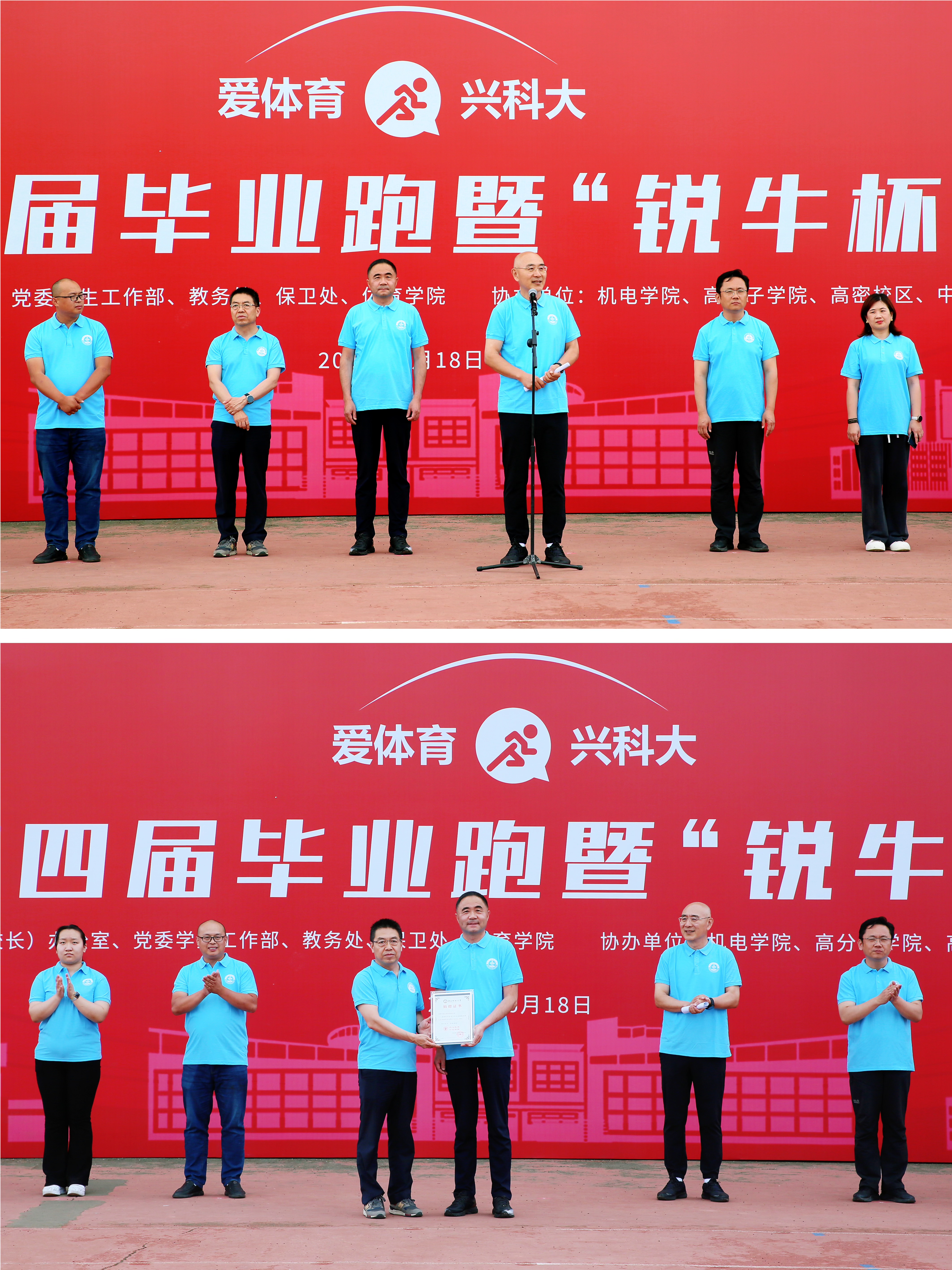 在起跑点处,毕业生们身着统一服装,在师长及学弟学妹们的陪伴下,满怀着对母校的眷恋和未来的憧憬蓄势待发。随着发令笛响,2000余名师生按照既定路线奋力奔跑,释放激情、熔铸梦想、奔向未来。校园中,随处可见红蓝相间的道旗、悬挂四周的横幅,“享受乐趣、增强体质、健全人格、锤炼意志”、“人人享受体育、健康拥抱未来”、“展现青春作为、彰显青春风采、贡献青春力量”等标语,都是科大青年“奋斗青春”的最美见证。科大青年在毕业跑中与地标相会、尽赏校园美景,进一步厚植科大家风,坚定“青春为中国式现代化挺膺担当”的理想信念,为踏上人生新阶段做好准备。完赛后,与会嘉宾分别为完赛运动员颁发奖牌和吉祥物。