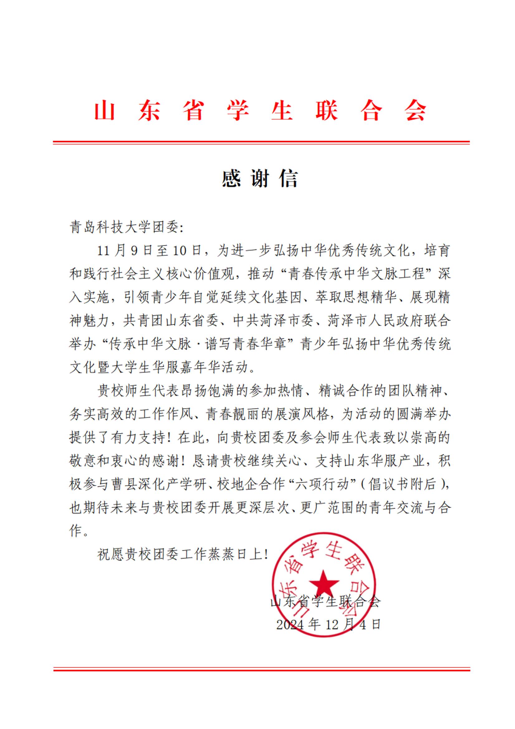 11月9日至10日,由共青团山东省委、中共菏泽市委、菏泽市人民政府联合举办的“传承中华文脉·谱写青春华章”青少年弘扬中华优秀传统文化暨大学生华服嘉年华活动在山东曹县举办,米兰官网学生社团汉韵研习社4名成员受邀参加本次活动。近日,山东省学生联合会向米兰官网团委发来感谢信,对米兰官网师生积极参与此项活动表示感谢。
