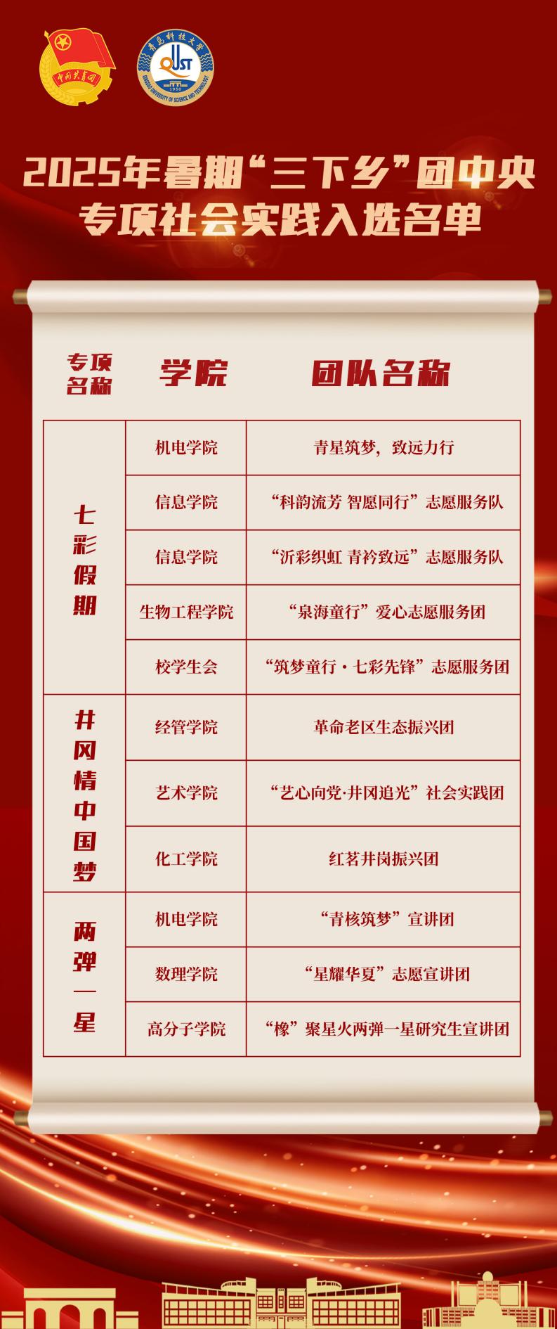 近日,团中央青年志愿者行动指导中心正式公布2025年全国大学生“两弹一星”精神志愿宣讲团、2025年关爱行动“七彩假期”志愿服务团名单,团中央青年发展部同步揭晓2025年“井冈情・中国梦”大学生实践团队名单。米兰官网凭借扎实的实践基础与创新的志愿服务模式脱颖而出,共有11支团队成功入选。其中,5支团队入围“七彩假期”志愿服务团,将在假期为青少年带来丰富多彩的关爱服务;3支团队入选“两弹一星”精神志愿宣讲团,肩负起传承和弘扬两弹一星精神的重任;另有3支团队入选“井冈情·中国梦”大学生实践团队,将在革命圣地汲取精神力量,开展深度实践探索。此次多个专项社会实践项目的入选,彰显了学校在社会实践与志愿服务领域的卓越成效与积极担当。