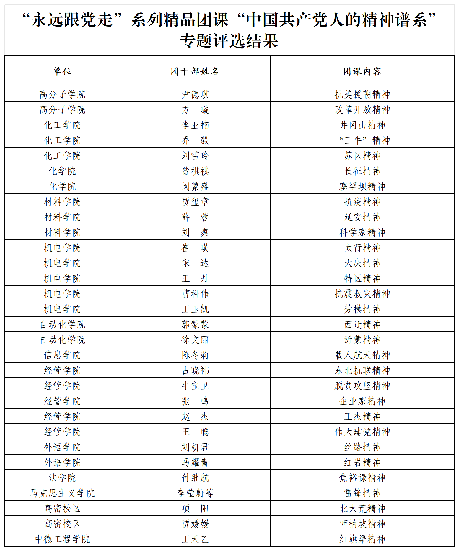 为深入学习宣传贯彻党的二十大精神,全面提升学习贯彻习近平新时代中国特色社会主义思想主题教育在青年学生层面的辐射带动作用,更好地面向广大青年做好党的创新理论的“青年化”阐释工作,校团委开展了“永远跟党走”精品团课评选活动。经个人申报、学院(校区)推荐、综合评审等环节,评选出“中国共产党人的精神谱系”专题精品团课30期,现将评选结果公布如下: