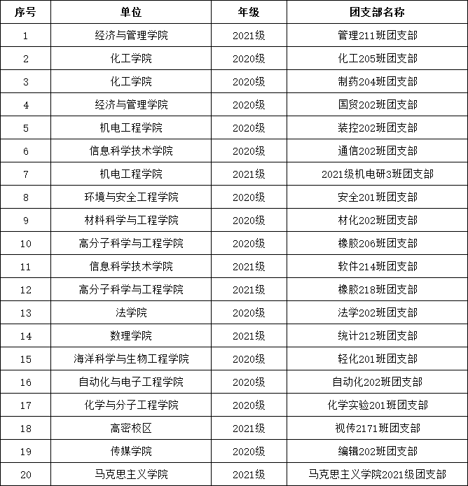 根据《关于第二期“团聚力”卓越团支部结项答辩的通知》要求,4月9日下午来自20个学院(校区)的30个优秀团支部在崂山校区第三报告厅依次进行答辩。结合各团支部结项材料提交、现场答辩表现,最终确定以下20个团支部为第二期“团聚力”卓越团支部,现进行公示,如对评审结果有异议,请向校团委组织部反映。