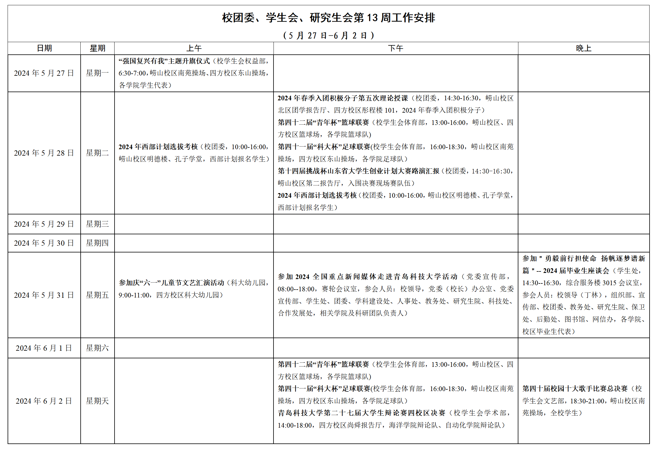 校团委、学生会、研究生会第13周工作安排
