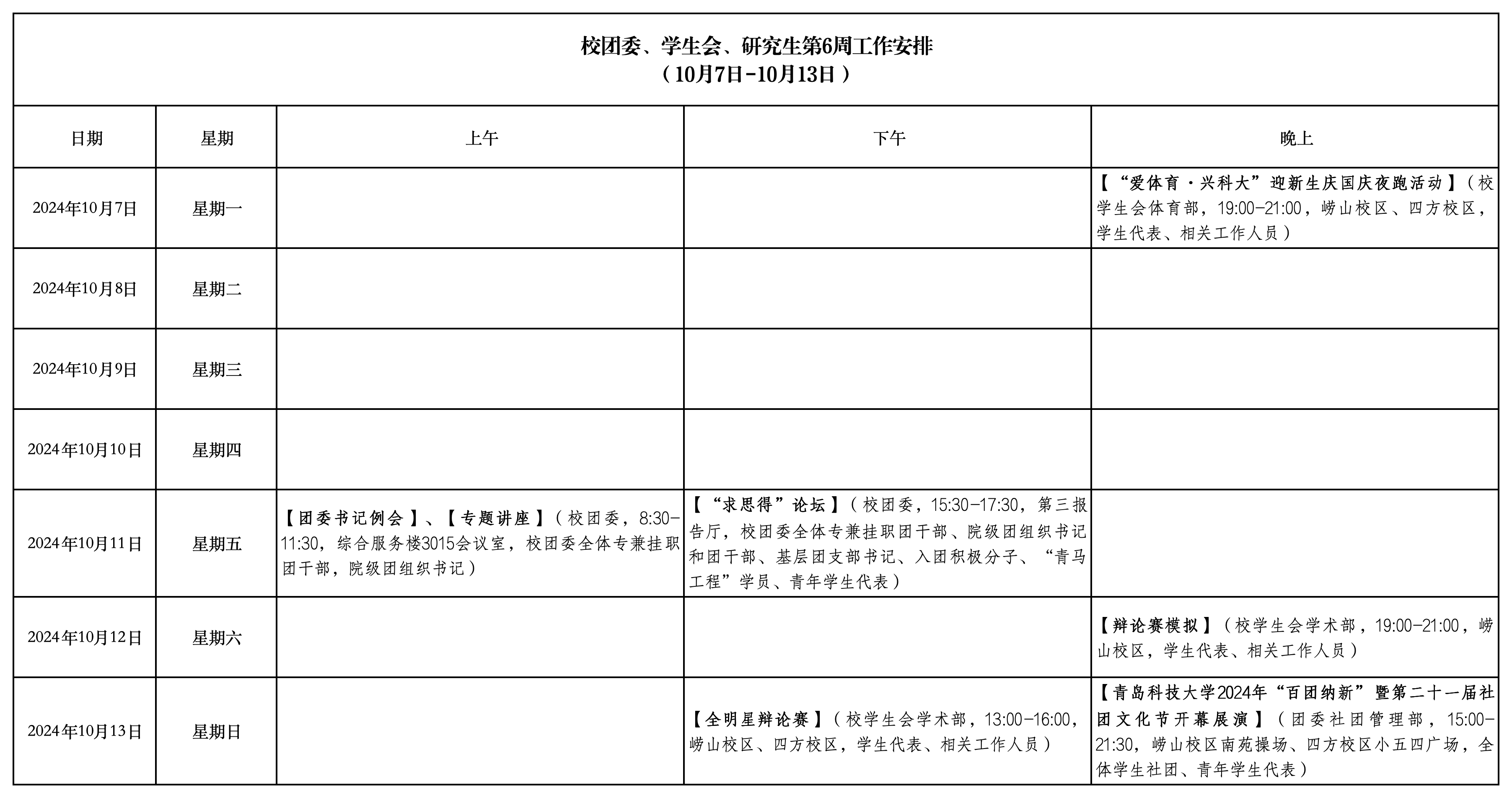 校团委、学生会、研究生会第6周工作安排