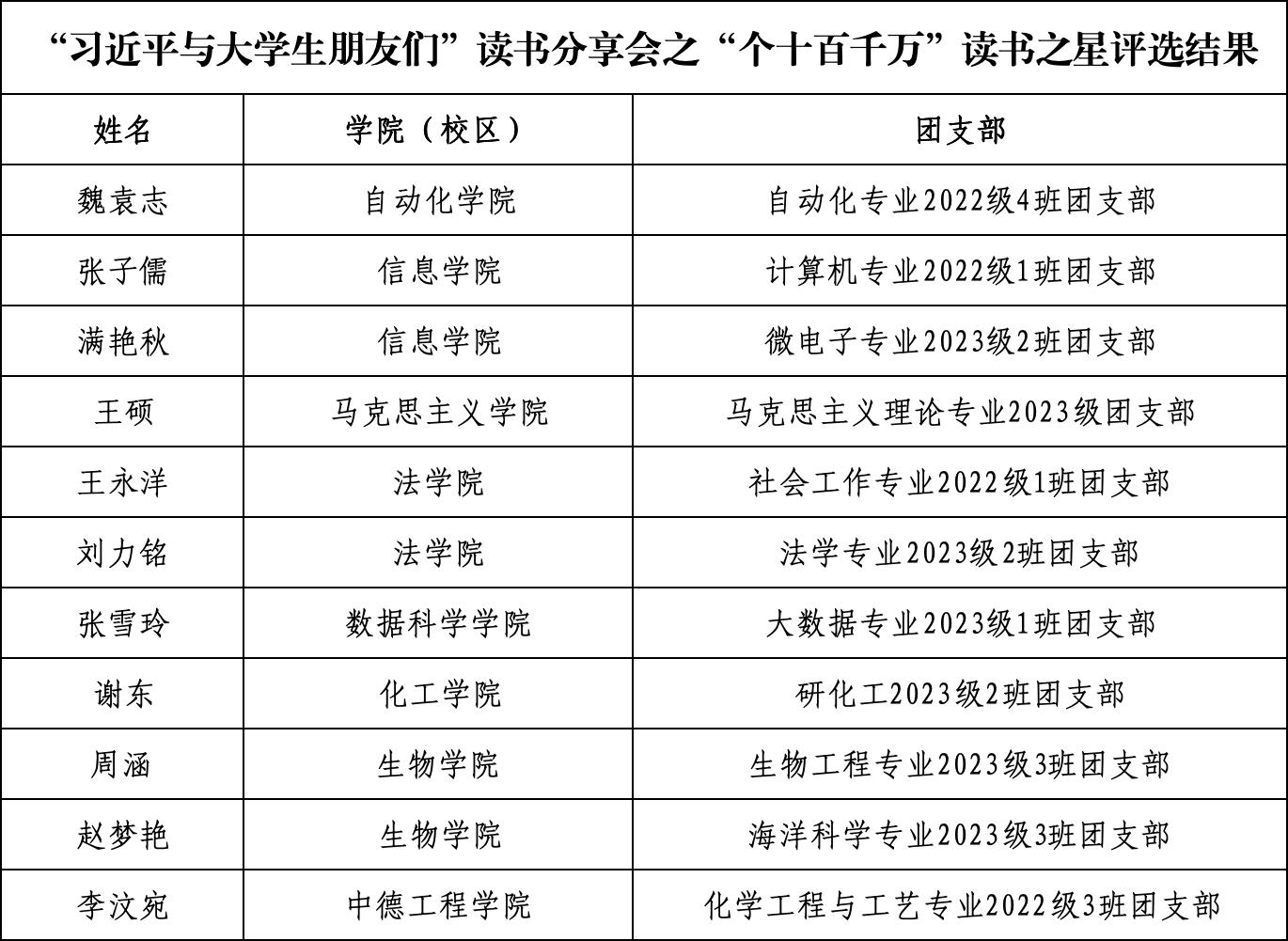 为深入学习贯彻习近平总书记关于青年工作的重要思想和关于教育的重要论述,进一步落实共青团中央、教育部联合印发的《关于做好〈习近平与大学生朋友们〉第一、二卷学习宣传工作的通知》,切实推进“个十百千万”读书工程,学校开展了“个十百千万”读书之星评选活动暨“习近平与大学生朋友们”读书分享会。经个人申报、学院(校区)推荐、综合评审等环节,评选出“个十百千万”读书之星11名,现将评选结果公布如下: