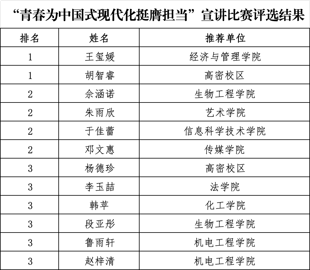 为深入学习贯彻党的二十届三中全会精神,贯彻落实习近平文化思想,深化党的创新理论宣传阐释,创新发展青年宣讲工作,打造一批优质宣讲课程,挖掘一批优秀宣讲人才,校团委组织开展了“青春为中国式现代化挺膺担当”宣讲比赛。经个人申报、学院(校区)推荐、综合评审等环节,评选出一等奖2名、二等奖4名、三等奖6名,现将评选结果公布如下: