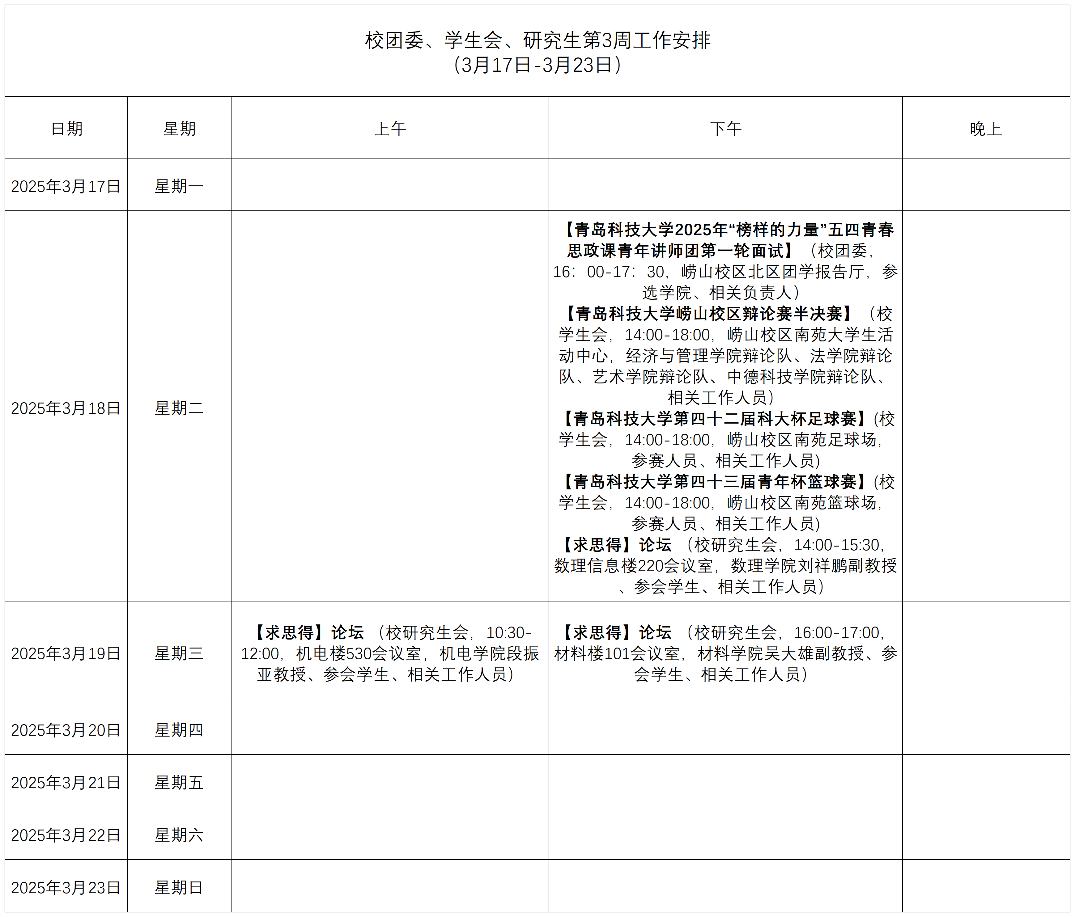 校团委、学生会、研究生第3周工作安排