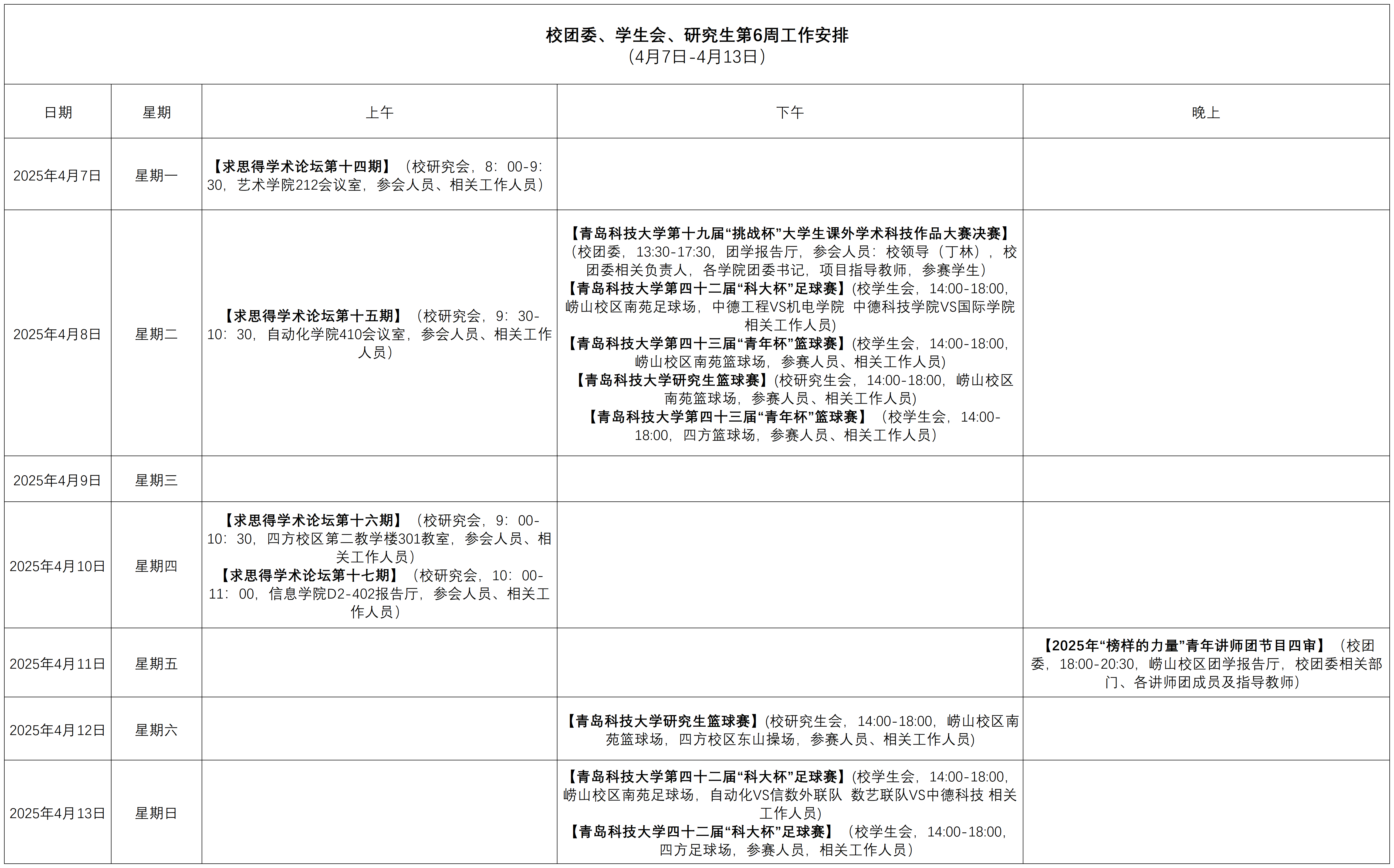 校团委、学生会、研究生第6周工作安排