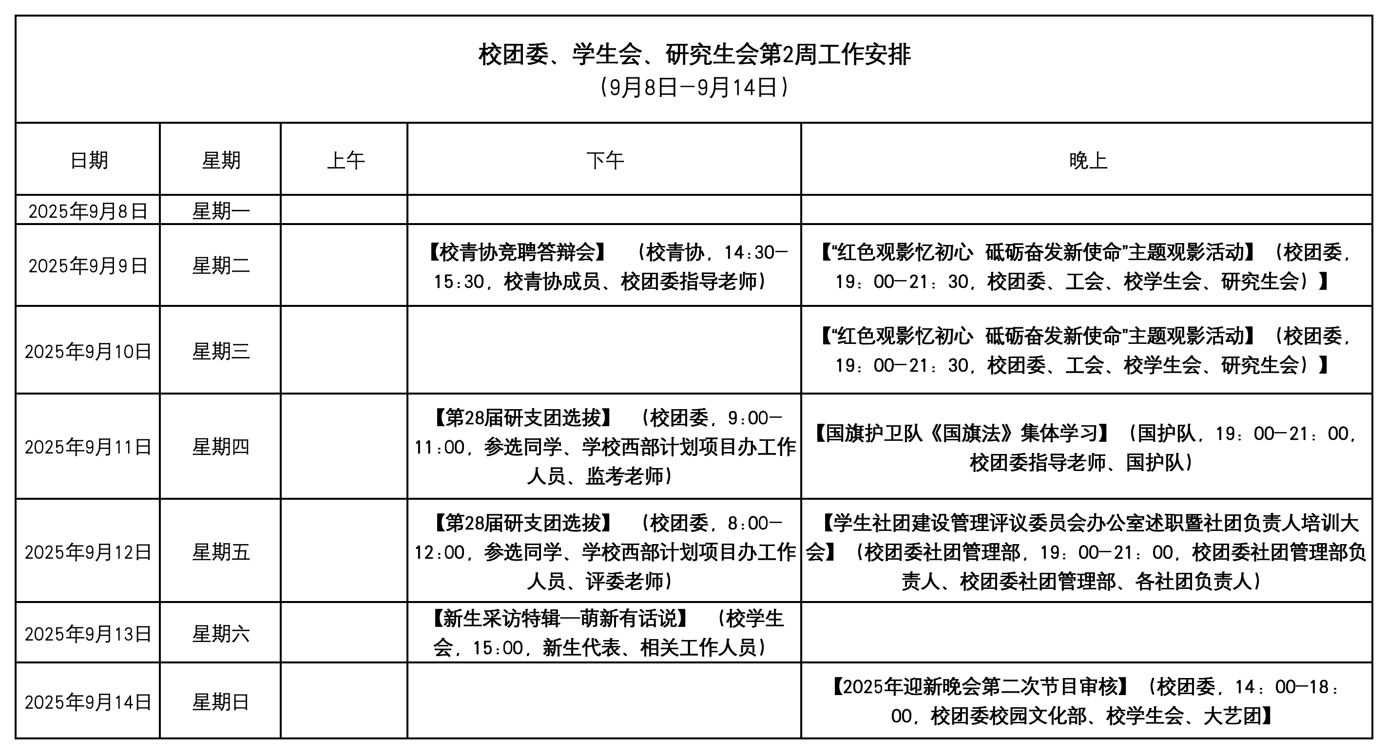 校团委、学生会、研究生会第2周工作安排