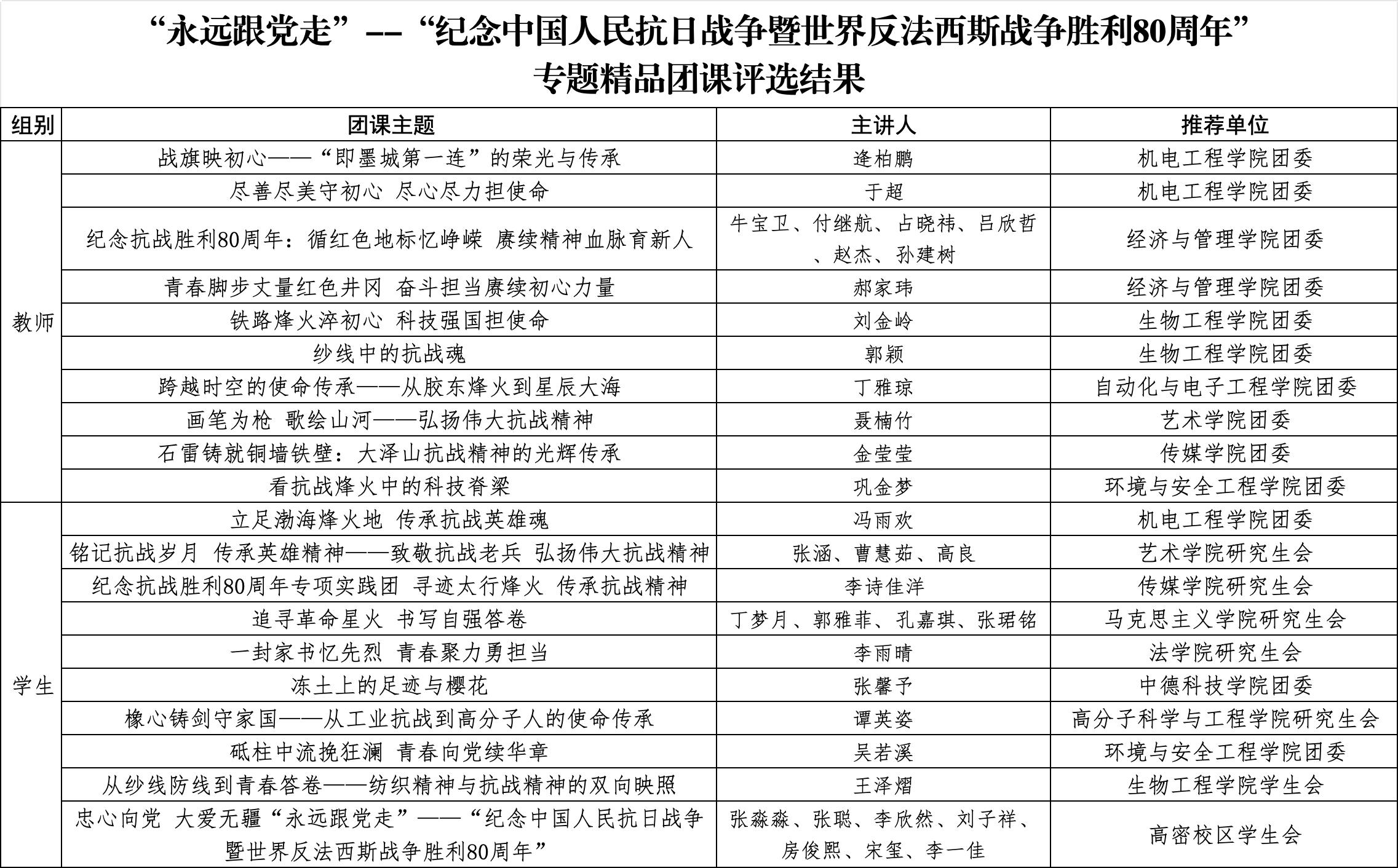 为深切缅怀抗战英烈,大力弘扬伟大抗战精神,引导广大团员青年深刻认识中国人民抗日战争在世界反法西斯战争中的重要地位与伟大贡献,从中汲取奋进力量,厚植爱国情怀,校团委开展了“永远跟党走”--“纪念中国人民抗日战争暨世界反法西斯战争胜利80周年”专题精品团课评选活动。经个人申报、学院(校区)推荐、综合评审等环节,评选出专题精品团课20期,现将评选结果公布如下: