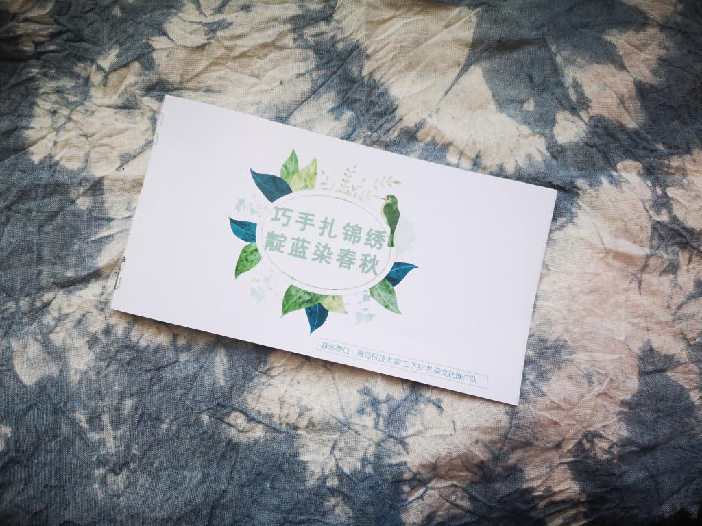 当日下午,队员们共同商讨决定制作一本“扎染宣传手册”,希望通过这种方式更有效地宣传扎染传统文化。宣传手册包括扎染的起源,扎染的工具简介,扎染具体步骤三个板块。封皮上印有团队微信公众号二维码,队伍将在微信公众号上定期发布扎染的相关内容,利用新媒体技术传播相关文化。商议好后,队员们各司其职,选取图片、查阅资料、书写文案,最终在团队的共同努力下,诞生出了一本蕴含着队员心血的宣传手册。