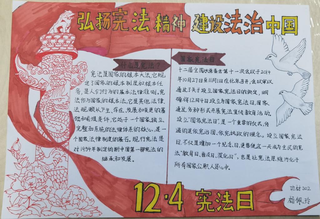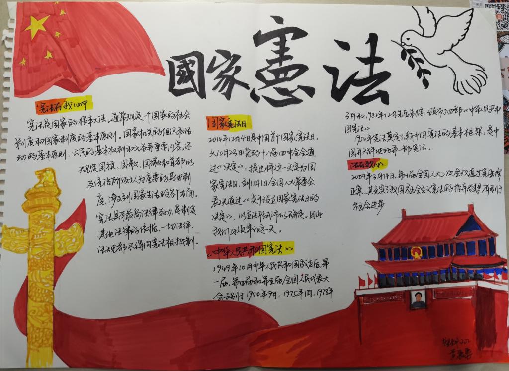 此外,我院还组织了“学崇高宪法,立尚德之心”的知识竞赛;“学宪明法,修身治国”手抄报活动以及“以法立心,筑梦青春”主题征文活动。截止目前,本次活动共收到18份优秀手抄报,50余篇优秀征文,充分展现同学们深刻学习宪法的热情。随后,相关照片将被汇总制成影集,以展览学习,继续激发同学们的学习热情,弘扬宪法精神。