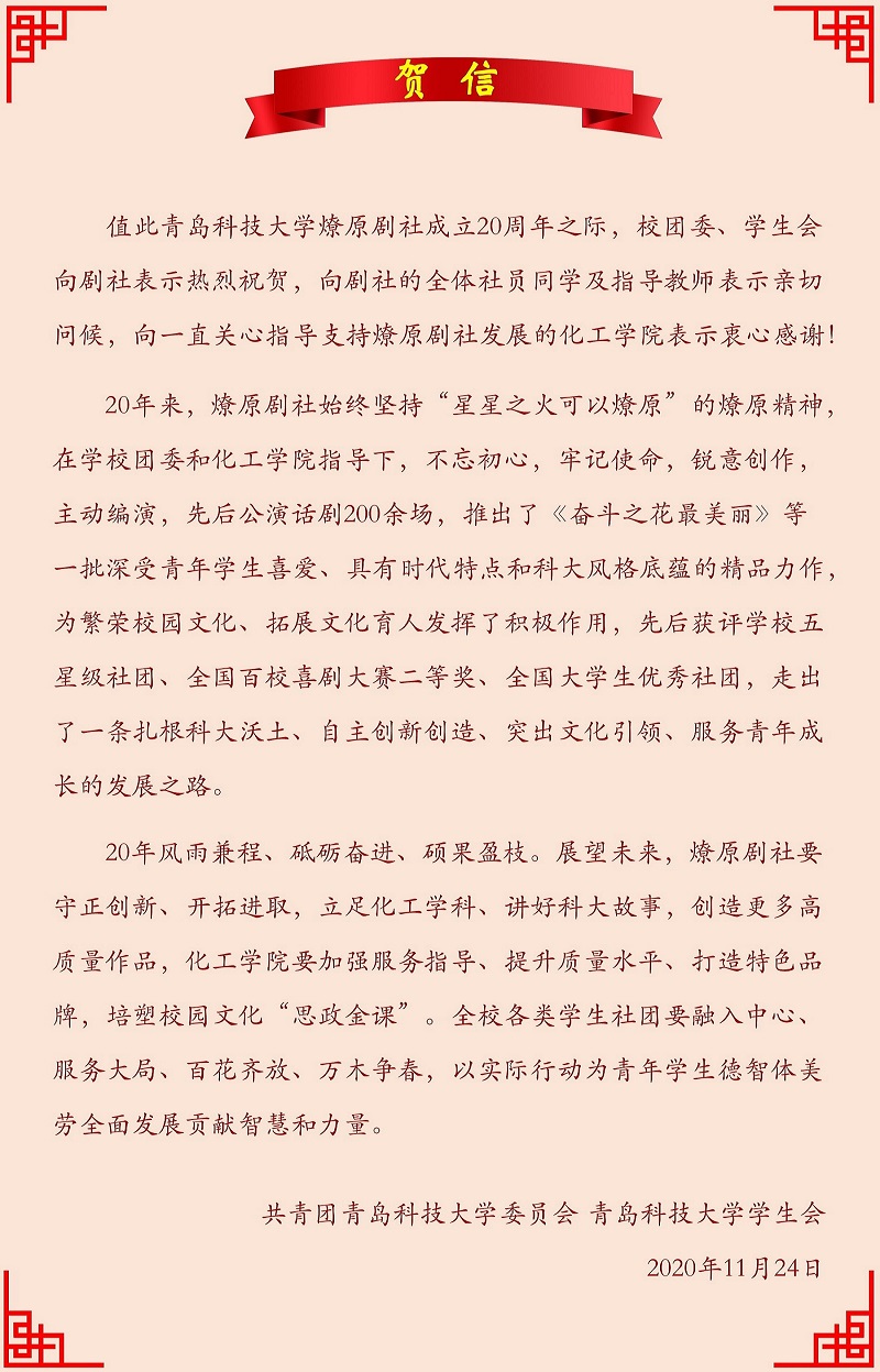 演出开始之前,校团委副书记陈兵宣读了校团委发来贺信,在贺信中肯定了燎原成立二十年来为繁荣校园文化、拓展文化育人发挥了积极作用,展望未来希望燎原剧社守正创新、开拓进取,立足化工学科、讲好科大故事,创造更多高质量作品,化工学院要加强服务指导、提升质量水平、打造特色品牌,培塑校园文化“思政金课”。