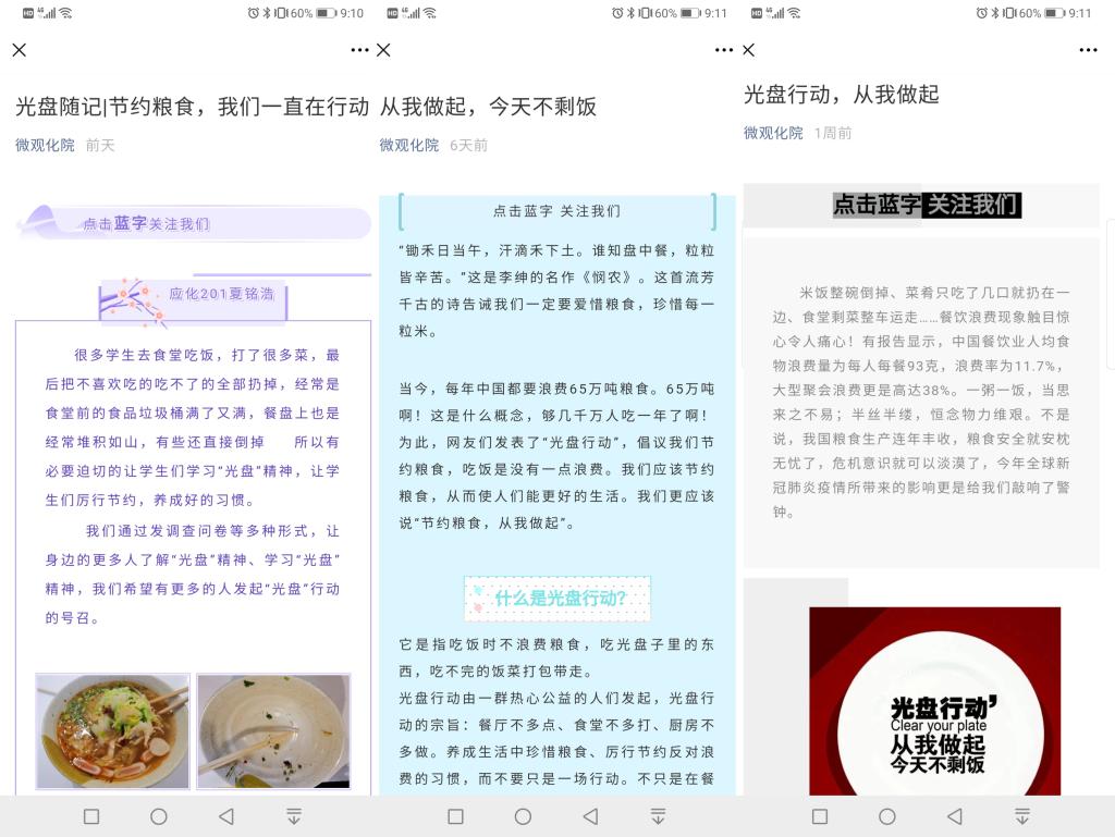 为深入贯彻习近平总书记关于坚决制止餐饮浪费行为的重要精神,弘扬中华民族的传统美德,十一月化学院开展了“制止餐饮浪费 培养节约习惯”主题活动,给同学们提供了一个进一步加深勤俭节约美德的机会,让同学们认识到制止浪费、勤俭节约的重要性。