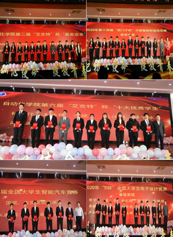 会上,吕万翔、王丽、张玉、池荣虎、曹梦龙分别为在第六届“艾克特”杯十大优秀学生评选活动、第二届“艾克特”杯“最美宿舍”评选活动、第十四届“西门子杯”中国智能制造挑战赛、第十五届大学生智能汽车竞赛、2020年“TI杯”全国大学生电子设计竞赛中获奖的同学颁奖。
