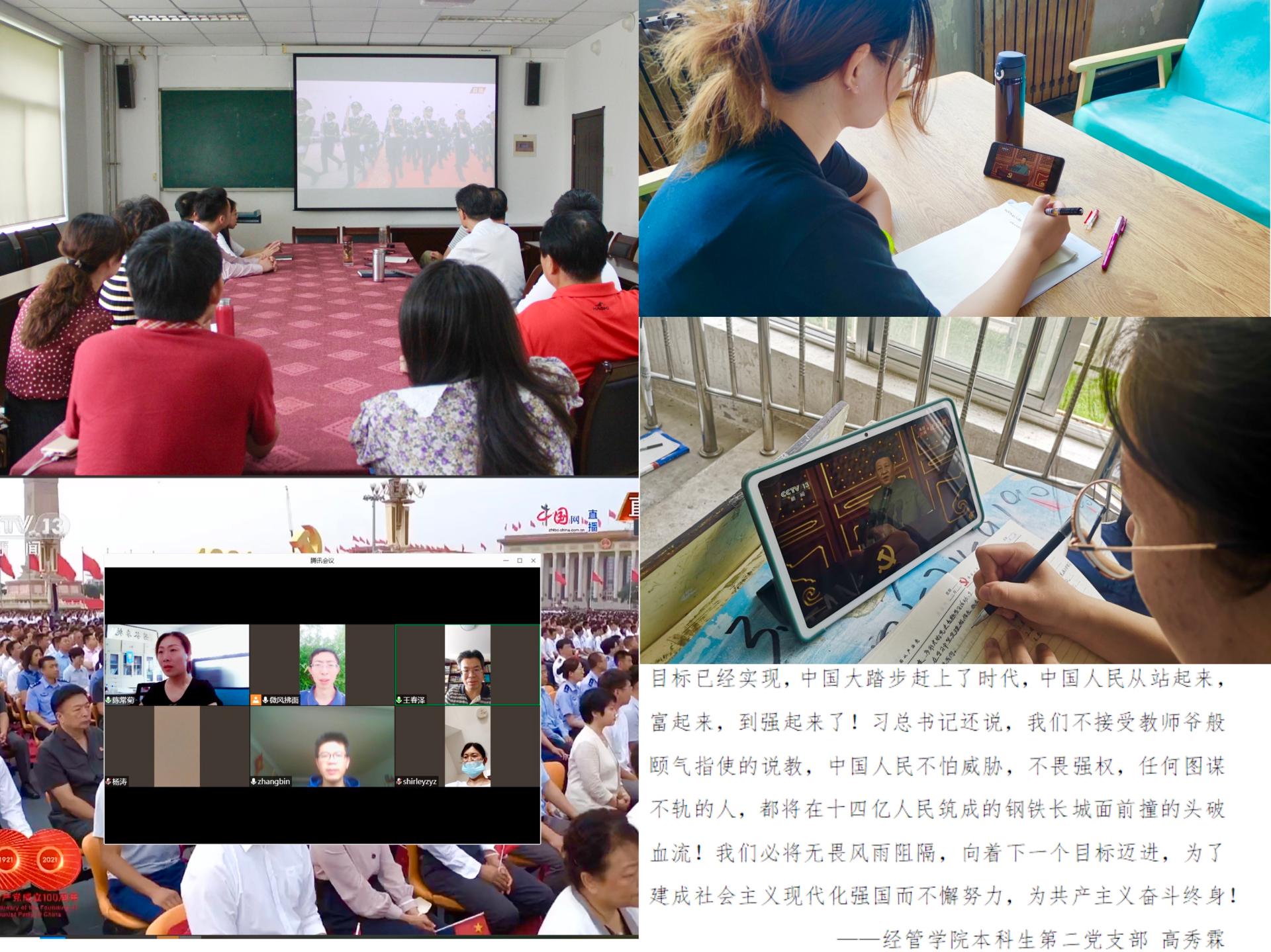 集中观看一次大会,齐奋进、鼓人心。7月1日上午,庆祝中国共产党成立100周年大会在北京天安门广场隆重举行。中共中央总书记、国家主席、中央军委主席习近平发表重要讲话。经管学院党委理论学习中心组、师生党员及广大团员以主会场与分会场相结合、集中学习与个人自学相结合的形式,多途径、多渠道收看大会盛况,并结合自身学习工作实际书写心得感想,向党向国表初心、话使命。全体师生表示,要切实将内心的赤诚与感动化为前进的动力源泉,听党的话,跟党走,立志高远,不畏艰难,鼓起勇气承担起时代责任。