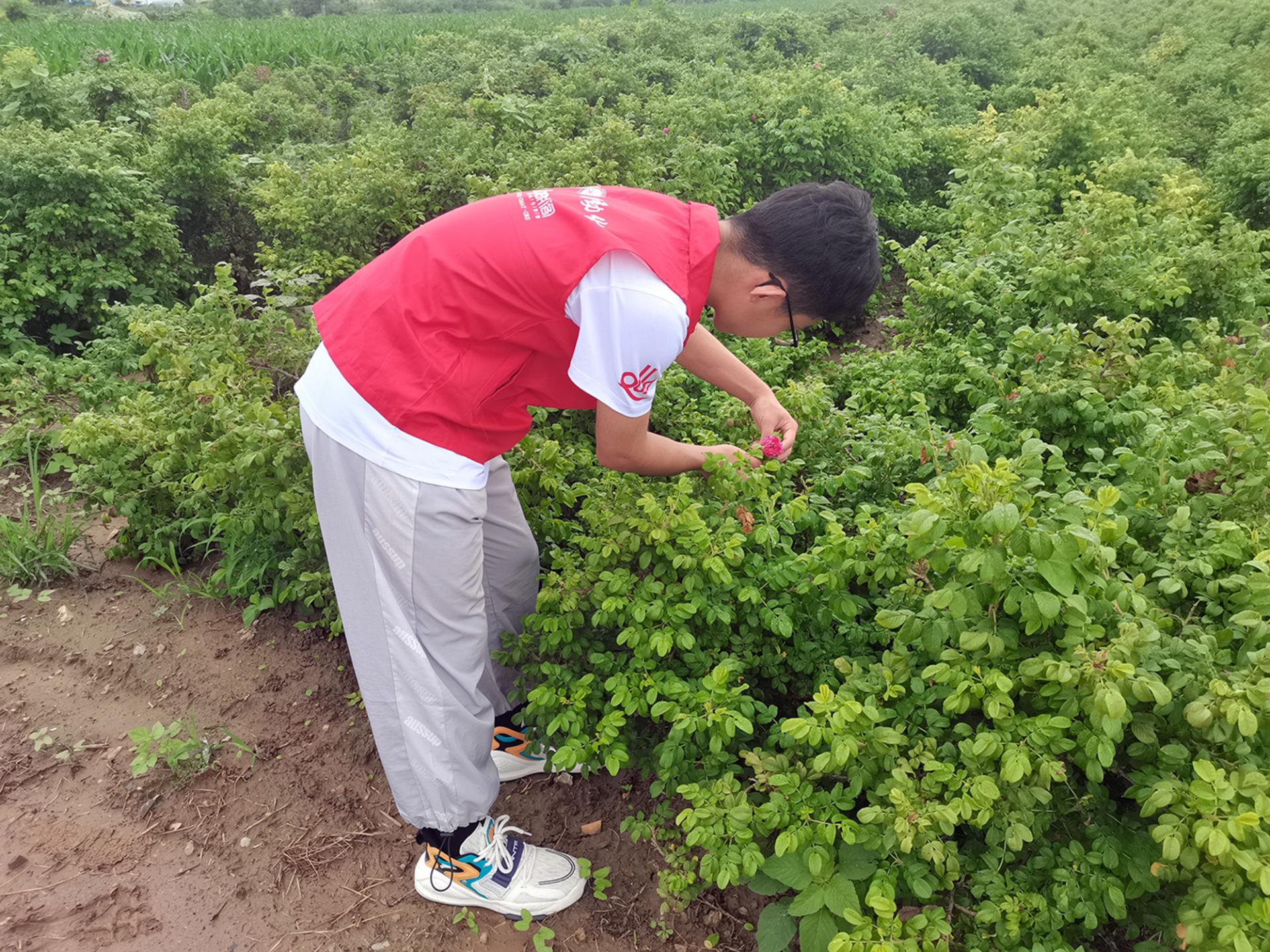 交谈过后,张召元带领团队成员前往田地实地考察,在田间地头,他向大家讲解玫瑰生长过程,合作社实施统一测土配肥、管理措施、集中用药、供应农资、采收、加工销售的“六统一”原则,提高玫瑰产量和品质。同时政府不定期聘请技术人员、农业专家来到生产基地指导花农进行修剪、管理、施肥、用药,严格按照绿色生产标准管理,进行标准化、规范化、统一化的种植,为生产高质量玫瑰提供保障。同时,考察团队走进田地观察玫瑰的生长,学习玫瑰花采摘的方法。