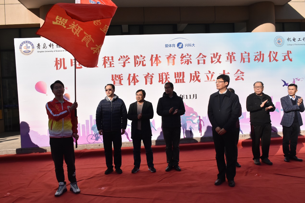 机电工程学院党委书记孙立军为“爱体育”APP人均里程数前20名同学颁奖,机电工程学院院长何燕为“爱体育”APP人均里程数前6名班集体颁奖,校团委书记毛常明宣读《关于机电工程学院团委成立机电学院大学生体育联盟的批复》并为机电学院大学生体育联盟授旗、学生处副处长曹永俊为学院体育联盟各协会代表授旗、机电学院大学生体育联盟学生代表李想宣读倡议书。