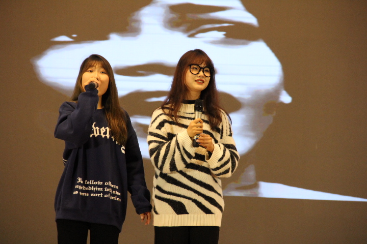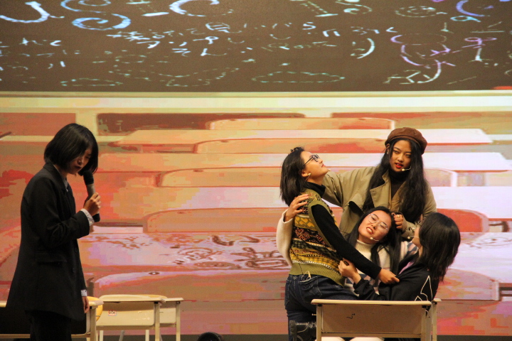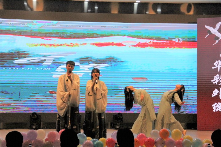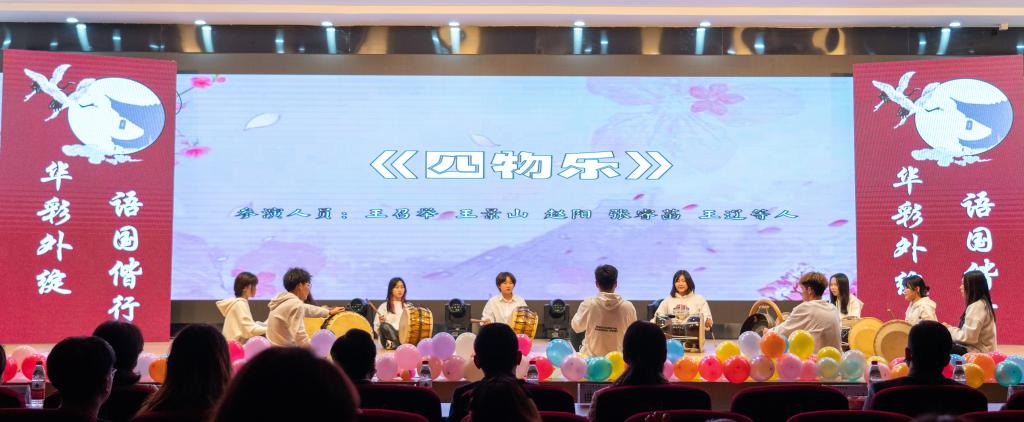 晚会开始前首先播放了新生寄语、外院小故事与学生会成员风采展示三段小视频。在新生寄语中,院领导表达了对新生的热烈欢迎与殷切期望;外院小故事记录了外院学子的日常点滴,展现了新生勤奋好学,团结奋斗的良好形象;在欢快的音乐中,大屏幕还依次介绍了学生会成员。倒计时后,晚会正式开始。开场的第一个节目是韩国传统乐器演奏《四物乐》。长鼓圆鼓咚咚作响,小锣大锣锵锵齐作。在锣鼓的和鸣中,带给观众们浓浓的异国气氛,渲染了现场热烈和谐的气氛。