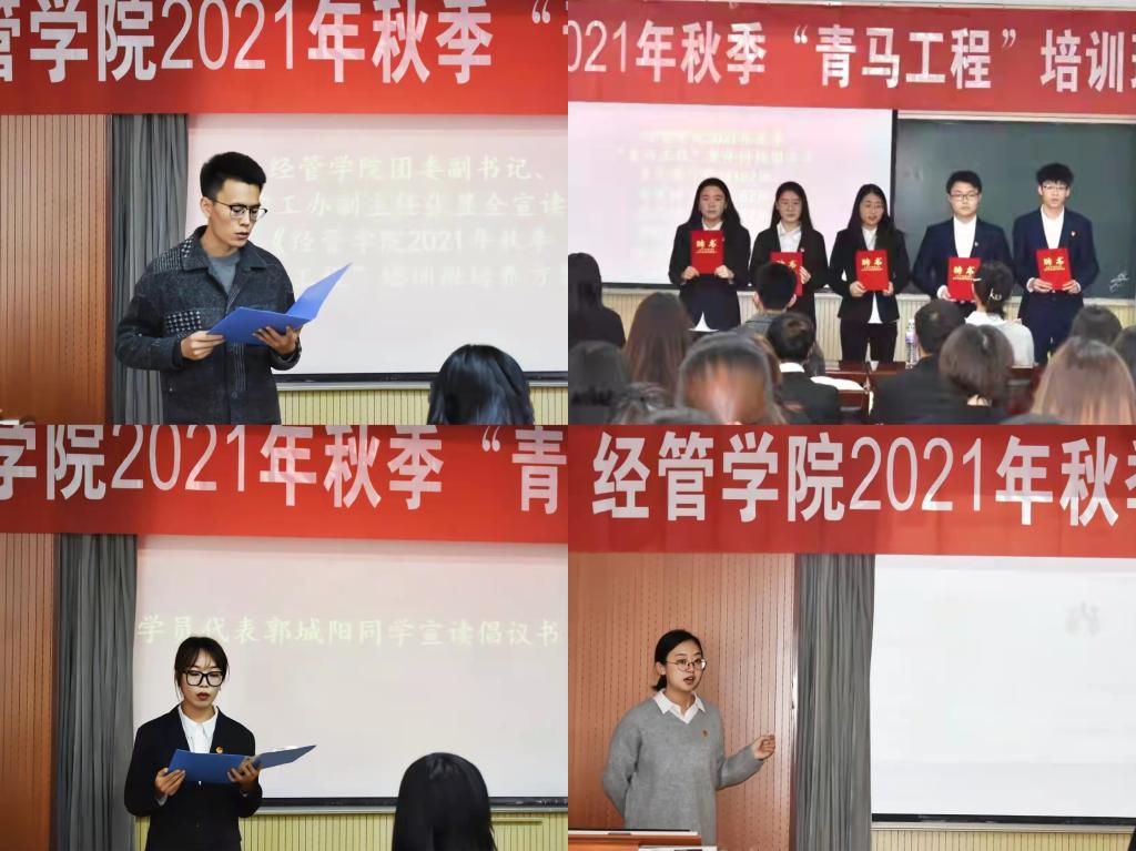 会议在庄严的国歌中拉开序幕,全场起立,奏唱中华人民共和国国歌。学院团委副书记、学工办副主任张显全宣读《经管学院2021年秋季“青马工程”培训班培养方案》,本次培训班采用课堂授课、实践锻炼和课题研究等形式,坚持组织培养与自我教育相结合、理论框架训练与能力结构训练相结合的培养方式,设置基础课程和特色课程进行集中培养。学院团委副书记、学工办副主任王聪宣读《经管学院2021年秋季“青马工程”青年讲师团聘任名单》,校团委王丹为青年讲师团颁发聘任证书。学员代表郭城阳宣读倡议书,号召培训班全体学员围绕中心大局,争做先锋表率,并呼吁大家共同努力,在实现中华民族伟大复兴的中国梦的历史进程中贡献自己的青春力量。校团委王丹作“青马工程”培训班开班第一讲,围绕共青团性质、共青团组织体系、共青团基本职责、团的组织生活的基本制度以及智慧团建系统等方面,全面、系统地讲授共青团基础知识。
