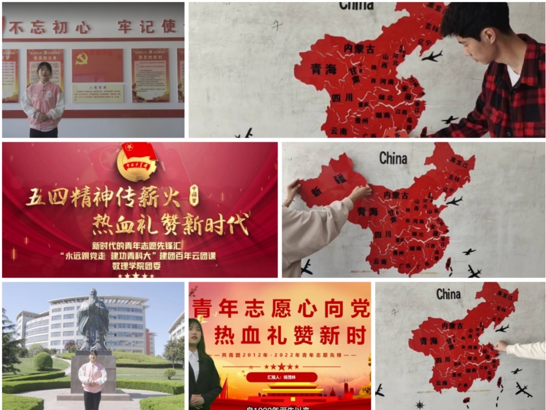 红色理想在此地孕育,红色序章从此处谱写。数理学院团委策划开展“高举青春火炬,共绘中华版图”团史红色地图视频展播活动,以青年团员骨干为宣讲主体,紧紧围绕团的百年奋斗历史,寻访革命先辈足迹,深入挖掘具有地域代表性的共青团红色故事,再现了共青团百年奋斗的光辉历程、伟大贡献、奋斗精神和宝贵经验。团史红色地图上的青运史,记录着每一个勇毅前行的足迹,饱含了奋斗的艰辛和革命岁月的激情澎湃,点燃青年团员践行初心接续奋斗、砥砺奋进青春报国的热情。以时间轴为顺序,选取2012-2022年间的共青团志愿服务大事记为主要内容,录制“永远跟党走,建功青科大”建团百年云团课,以青年学生喜闻乐见的形式讲好党领导青年运动的百年光辉历程,激励和引导广大青少年坚定不移听党话、跟党走。