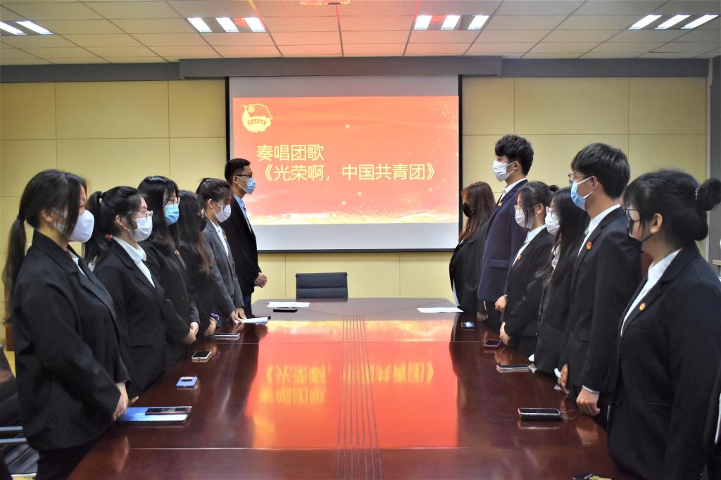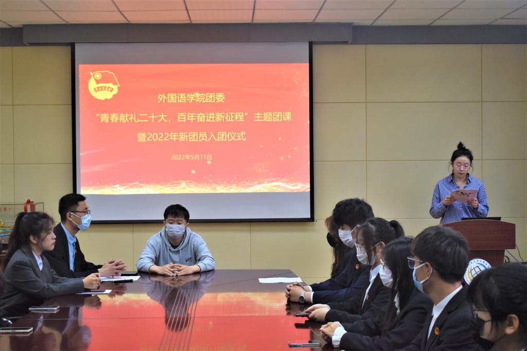 为进一步弘扬五四精神,增强”听党话、感党恩、跟党走“的思想觉悟和行为自觉,庆祝建团100周年,5月11日18:00,AC米兰中国官网外国语学院“青春献礼二十大,百年奋进新征程“主题团课暨2022年新团员入团仪式在外院楼517隆重举行。出席本次活动的有外国语学院团委副书记兼学工办副主任李东阳老师、王雨昕老师和团委老师张湘钧,五位新团员以及2021级全体班长、团支书。