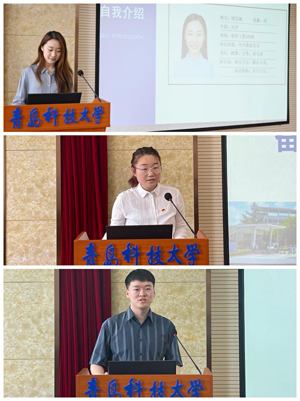 青马班讲师团成员、优秀毕业生团员国芸祯、徐金凯、翟晓敏向同学们作经验分享交流,展示优秀团员风采。国芸祯同学目前已被保送至山东大学,她同学结合自己的经历,从实践活动、生活态度,计划目标等几个方面作经验交流,她说:“希望学弟学妹们不要随波逐流,要提前制定目标,并为此积极准备,勇敢前行。”徐金凯同学已保送至华东师范大学,他从学习方法、科技竞赛,职业规划等方面分享了满满的干货。翟晓敏同学是通信182班团支书,带领团支部荣获卓越团支部称号,目前已成功签约歌尔科技,她就自己起起落落的大学历程提醒大家要时刻保持积极乐观的心态,勇于面对失败,不断提升自己,多尝试,敢奋斗,坚持学习,一定会给自己一份满意的答卷。三位同学最后都表达了即将离开母校的不舍和对学弟学妹的美好祝愿。
