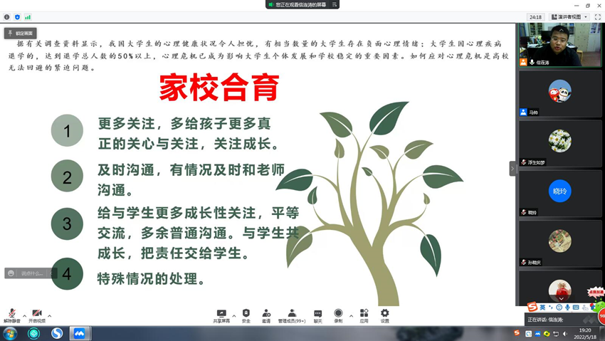 2018级辅导员闵繁盛、王森结合毕业年级特点,从考研情况、工作就业情况、疫情防控、大学生心理健康教育四个方面,和各位学生家长进行了汇报和沟通,呼吁各位家长关注孩子目前生活状态,关心爱护孩子的心理健康,了解孩子对未来的规划,顺利度过大学生活的最后一个多月的时间,迎来崭新的学习、工作生活。