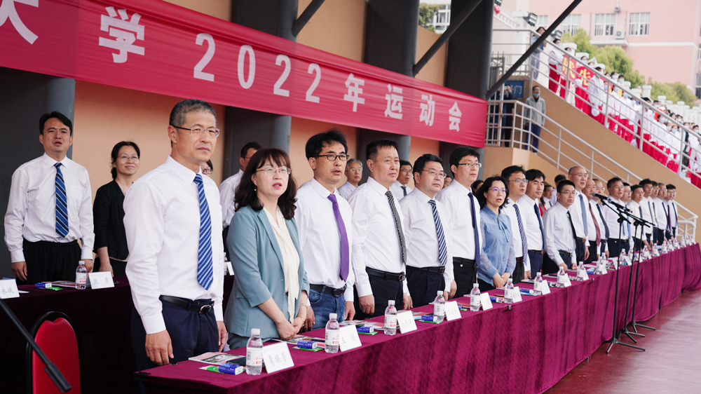 开幕式进行第二项,升国旗、奏国歌,学校国旗护卫队护送国旗到升旗台,全体师生肃立注目。升旗仪式完毕,校党委常委、副校长李勇致开幕词,预祝运动会成功举办,激励同学热爱体育,增强体质。