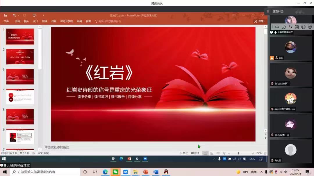 欲知大道,必先为史。习近平总书记在党史学习教育动员大会上强调:“回望过往的奋斗路,眺望前方的奋进路,必须把党的历史学习好、总结好,把党的成功经验传承好、发扬好。”在时代的变迁中,红色书籍所彰显的革命精神有着永恒的价值,它将感召后人不畏艰险、砥砺前行。由潘政华同学、袁耀钦同学为大家分别介绍了《红岩》与《林海雪原》两本书,讲述了正是无数革命先辈前仆后继、舍身为国,才有了今天来之不易的幸福生活。抚今追昔,我们不能忘记。“献礼”二十大,汲取红色力量。实现中华民族伟大复兴,需要一代又一代人为之努力。我们把握历史主动,争取更大荣光。请党放心,强国有我,传承爱国精神,我们在行动!