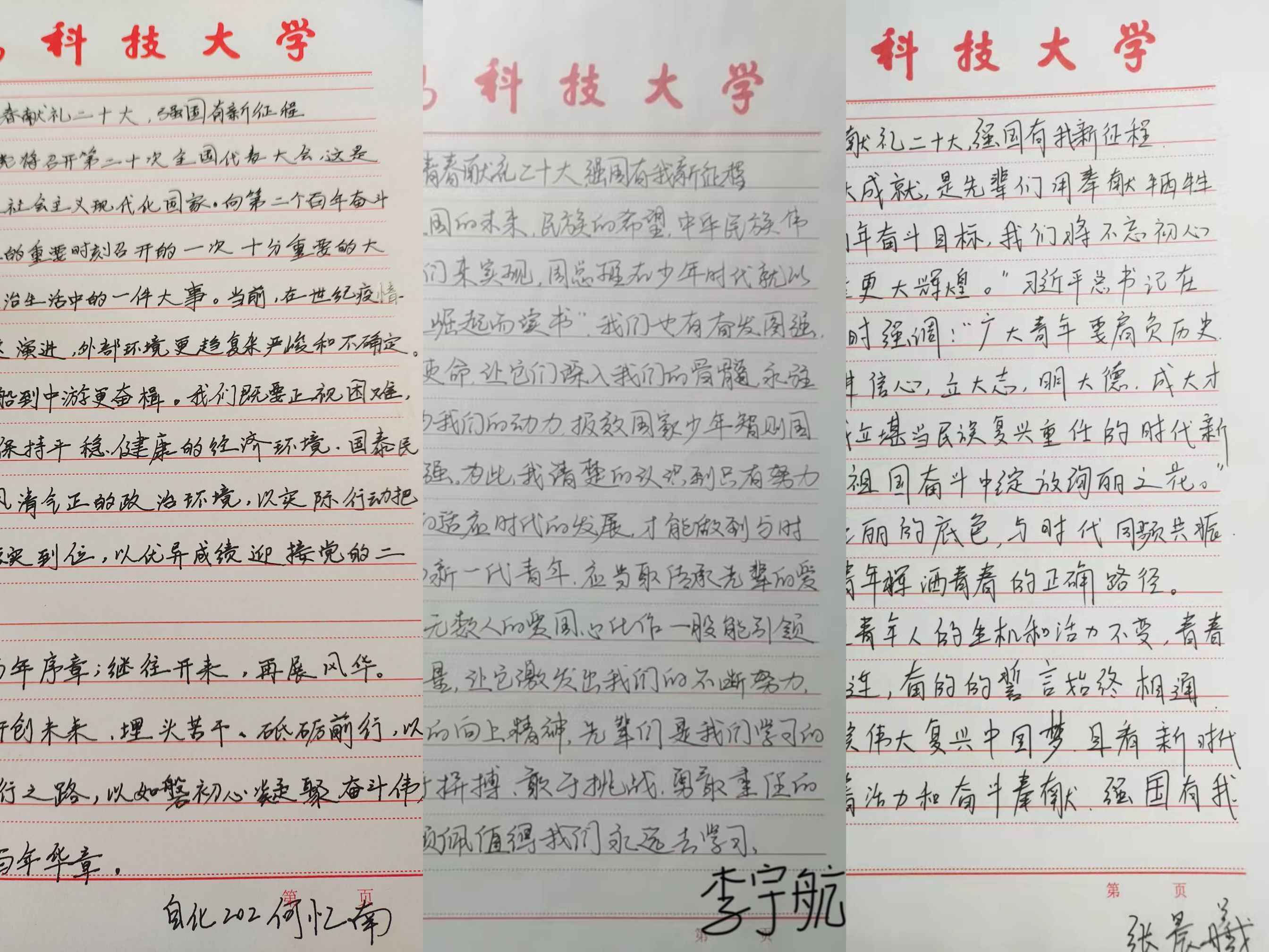 喜迎二十大青春著华章。自化202支部积极参与中国青年网组织开展的2022年“奋斗与成长”大学班级创意微文征集活动,鼓励大家通过青年人的视角讲述奋斗的故事。征文通知发出后,支部成员积极响应,团支部投稿率超90%,同学们纷纷用笔抒发自己的情怀,表达青年人对使命担当的思考。彭菲同学提到:如今,我们的党又迈入了一个万紫千红、阳光明媚的春天,我们沐浴着春光,党的光辉照进了我们每一个人的心中。正如李宇航同学感悟到:作为新一代青年,应当去传承先辈的爱国主义精神,将无数人的爱国之心化作一股引领我们前进的力量。书写二十大,展现强国风范。当代青年人应继续坚定理想信念,练就过硬本领,始终保持艰苦奋斗的前进姿态,在实现中华民族伟大复兴中国梦的新长征路上奋勇搏击,同时以勤恳奋斗、勇担责任的靓丽姿态和精神风貌喜迎党的二十大。请党放心,强国有我,感悟红色底蕴,我们在行动!